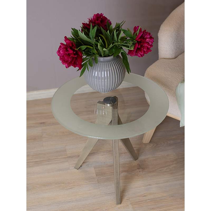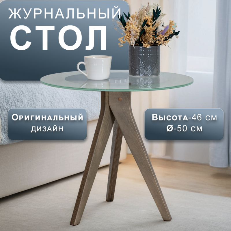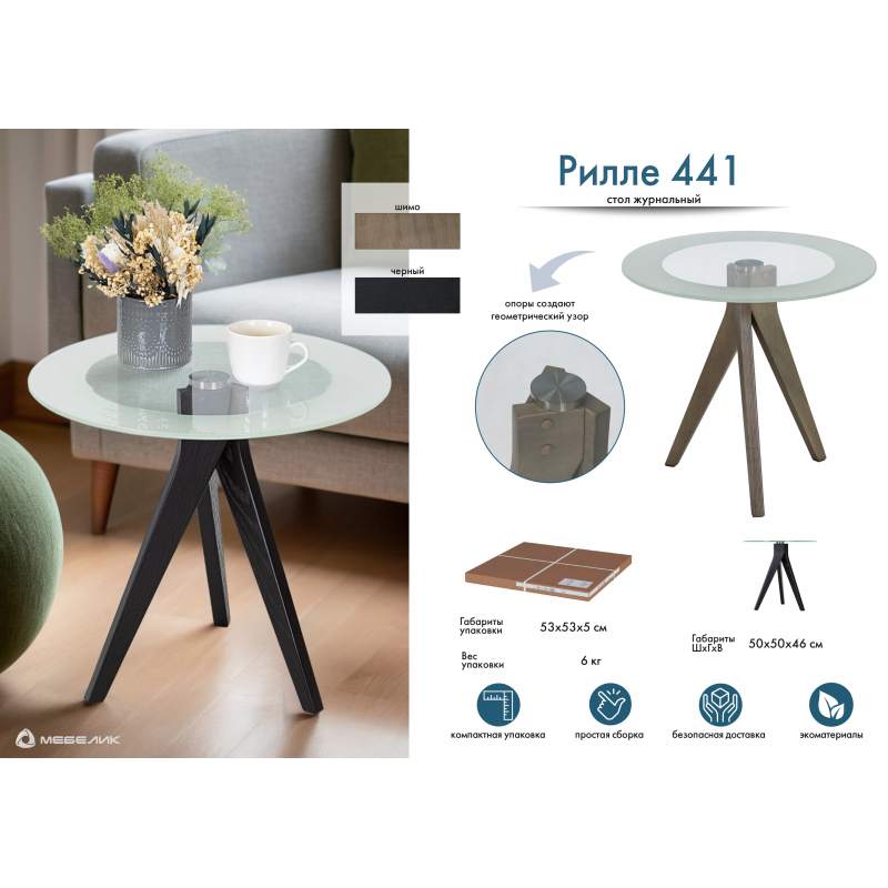 Журнальный столик Рилле 441 – это изящный и компактный предмет мебели, подходящий для любого интерьера от классики до лофта. Рилле 441 прекрасно справляется с ролью как журнального, так и прикроватного или придиванного столика. Опоры, выполненные из шпона берёзы (толщиной 24 мм), обеспечивают устойчивость, надёжность и долгую службу, а покрытие эмалью и тиснение с имитацией рисунка дерева придают столику естественную красоту. Обрамление круглой столешницы диаметром 500мм из стекла (8мм) пескоструйным рисунком шириной 80мм и минималистичный геометрический узор, который создают опоры, формой напоминающие бумеранг, подчеркнут уникальность любого интерьера.