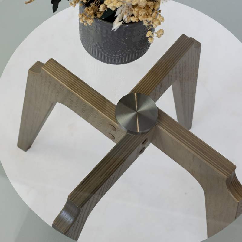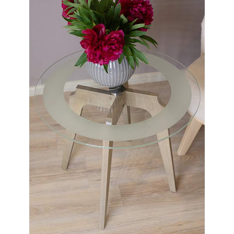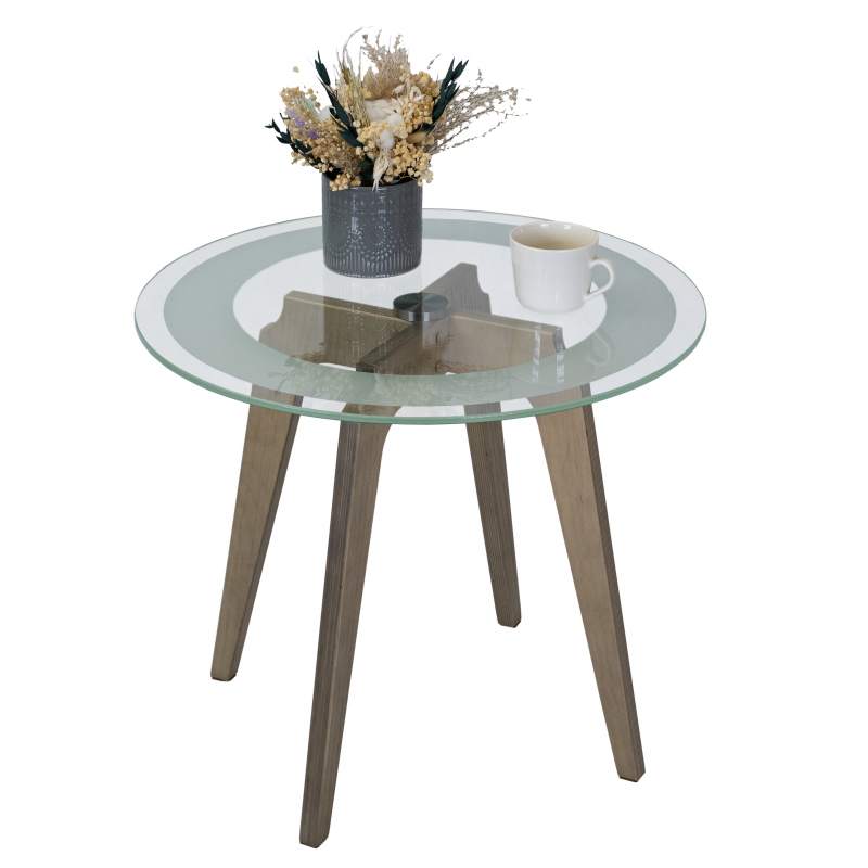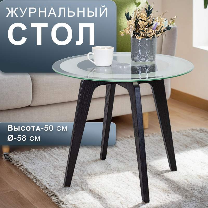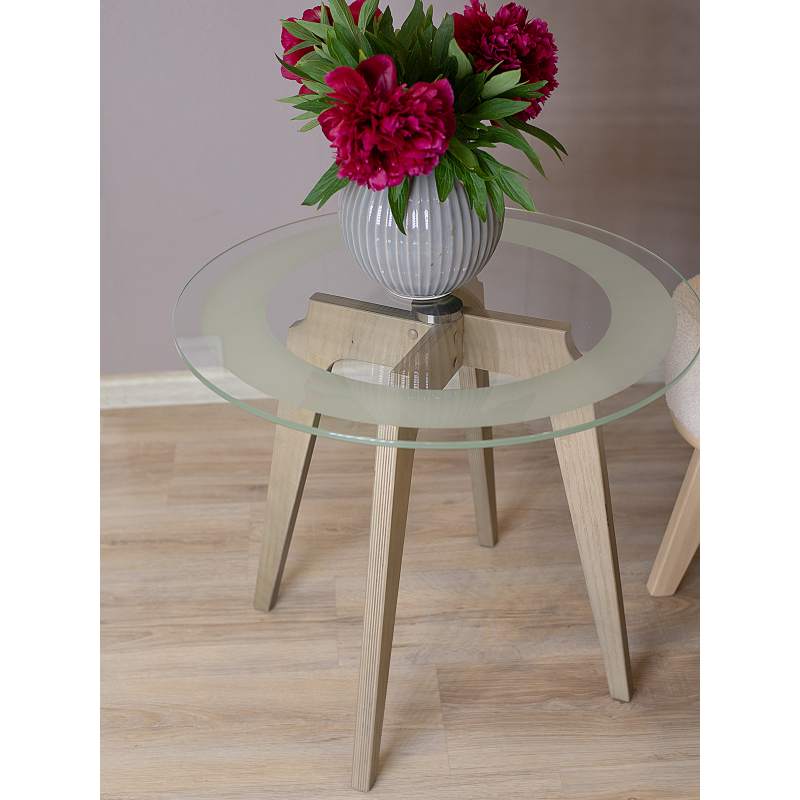 Журнальный столик Рилле 447 – это утончённый и компактный предмет мебели, подходящий для любого интерьера от классики до лофта. Рилле 447 прекрасно справляется с ролью как журнального, так и прикроватного или придиванного столика. Четыре опоры, выполненные из шпона берёзы (толщиной 24 мм), обеспечивают устойчивость, надёжность и долгую службу, а покрытие эмалью и тиснение с имитацией рисунка дерева придают столику естественную красоту. Изящность столешницы диаметром 580мм из стекла толщиной 8мм подчёркивает эстетичный пескоструйный рисунок шириной 70мм, создающий внутреннюю окружность. В сочетании с геометрическим крестообразным узором он добавит уникальности любому интерьеру.