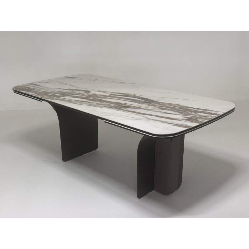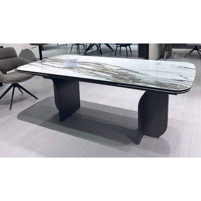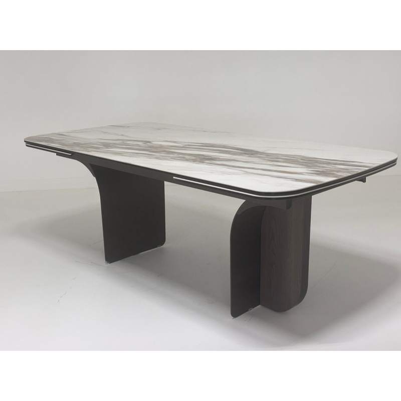 - двухсторонняя торцевая система раскладывания, две независимые вставки по краям по 50 см позволяют увеличить длину столешницы до 250 или 300 см при необходимости, глянцевая керамика, толщина столешницы 15 мм (5 мм керамика + 10 мм закаленное стекло), не впитывает загрязнения, термостойкая;