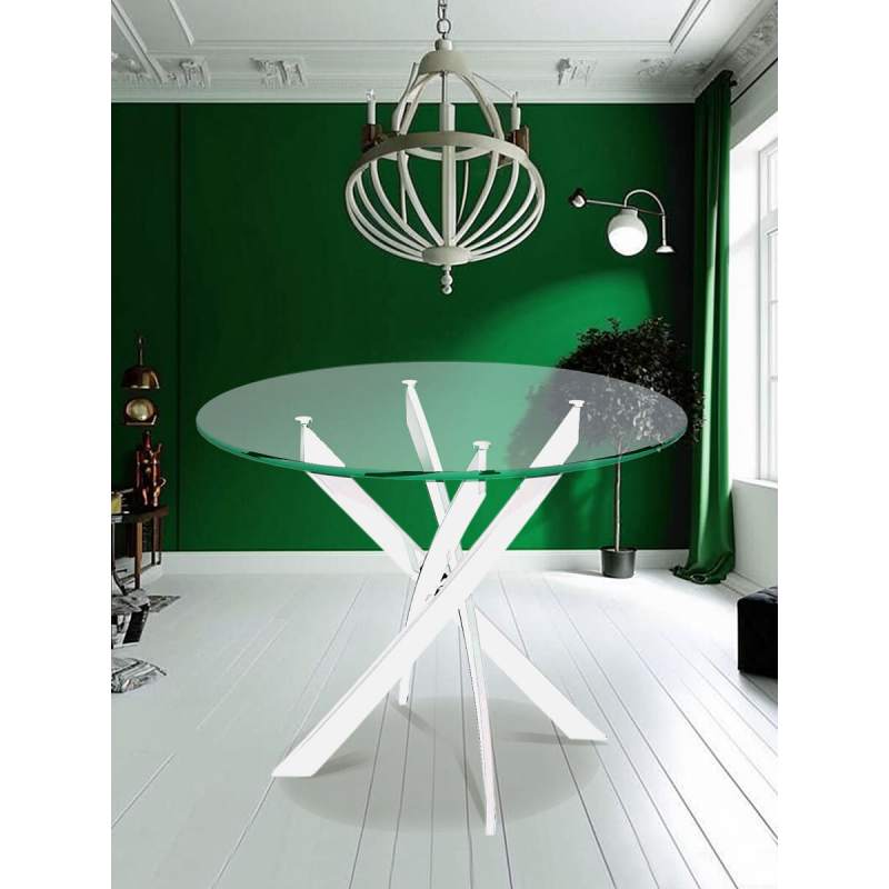 Стол круглый KENNER R1000, ножки - белые, стеклянная столешница. Стильные, дизайнерские столы для дома. Фабрика "Кеннер". Гарантия качества. Быстрая доставка по РФ. Интерьерный стол с толстой столешницей и надежным металлическим основанием. Полностью стеклянной столешнице не страшна влага или средства бытовой химии, ее тяжело повредить и разбить Цвет белый/стекло прозрачное Гарантия 24 месяца.