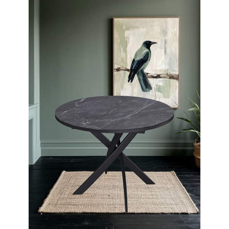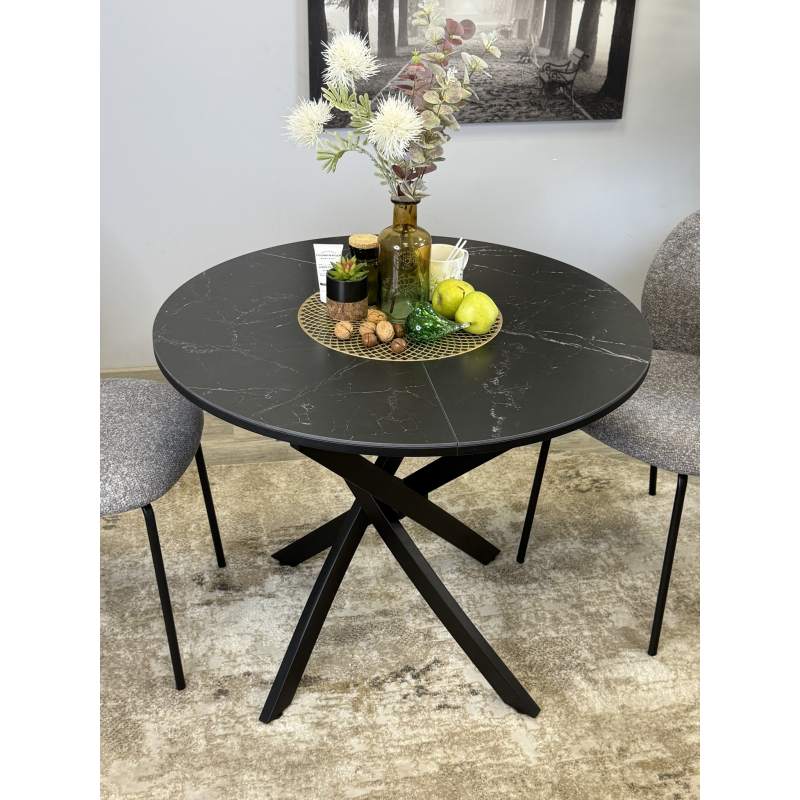 Ключевой особенностью этого стола является керамическая поверхность диаметром 90 см и долговечным, стабильным основанием. Дополняет комплект вставка на 30 см, расширяющая площадь стола.ОСНОВНЫЕ ПРЕИМУЩЕСТВА Стол сконструирован так, чтобы идеально подходить семье из трех-четырех человек. Керамическая столешница устойчива к воздействию различных домашних неприятностей. Благодаря керамической вставке есть возможность увеличивать размер стола при необходимости. Столешница премиум-класса Керамическая продукция толщиной 5,6 мм отличается высокой стойкостью к царапинам, способна выдержать экстремально высокие температуры, обладает водоотталкивающими свойствами и устойчивостью к воздействию бытовой химии, а также сохраняет свой первоначальный цвет на протяжении всего срока эксплуатации. Высокая надежность материалов Центральное основание спроектировано так, чтобы не создавать помех при посадке. Столешница надежно закреплена и обеспечивает стабильность конструкции. Цвет черный/керамика мрамор черный Гарантия 24 месяца.