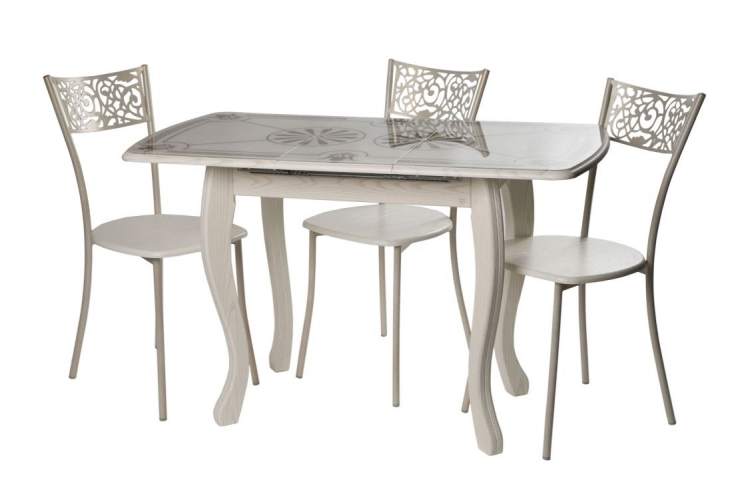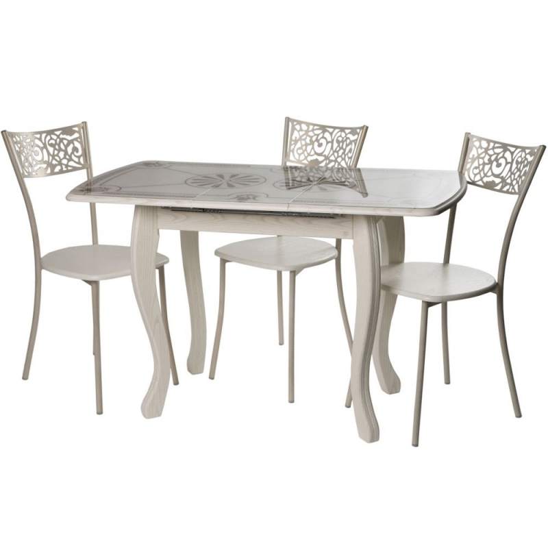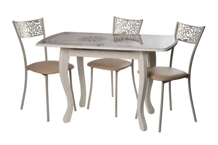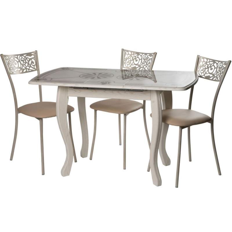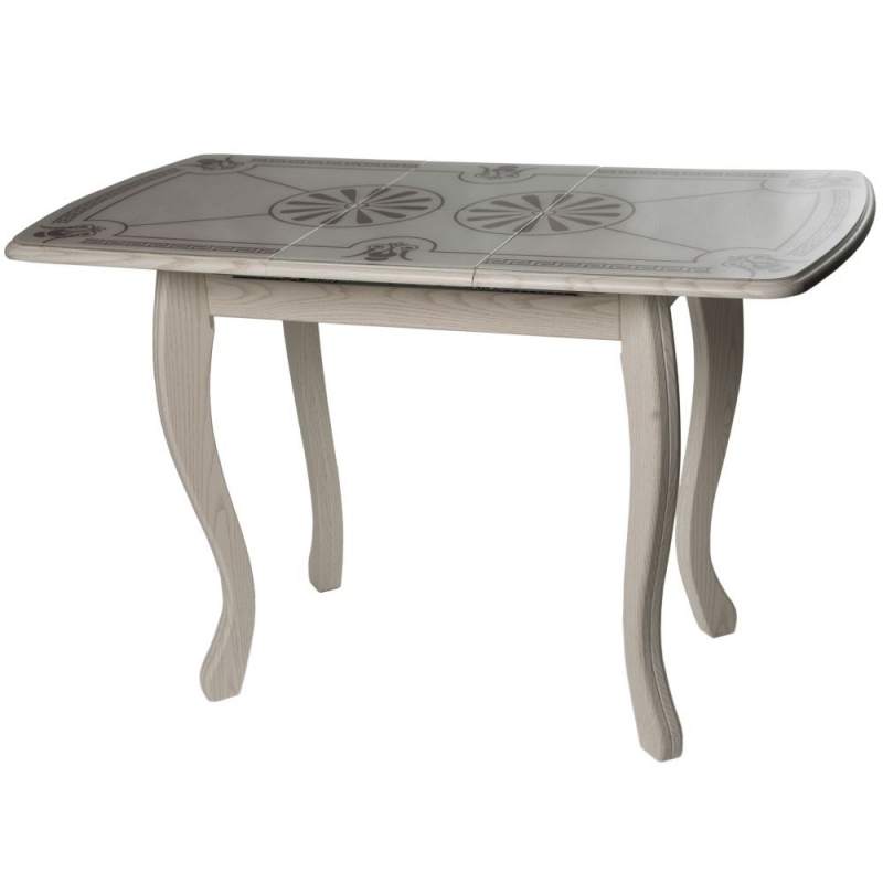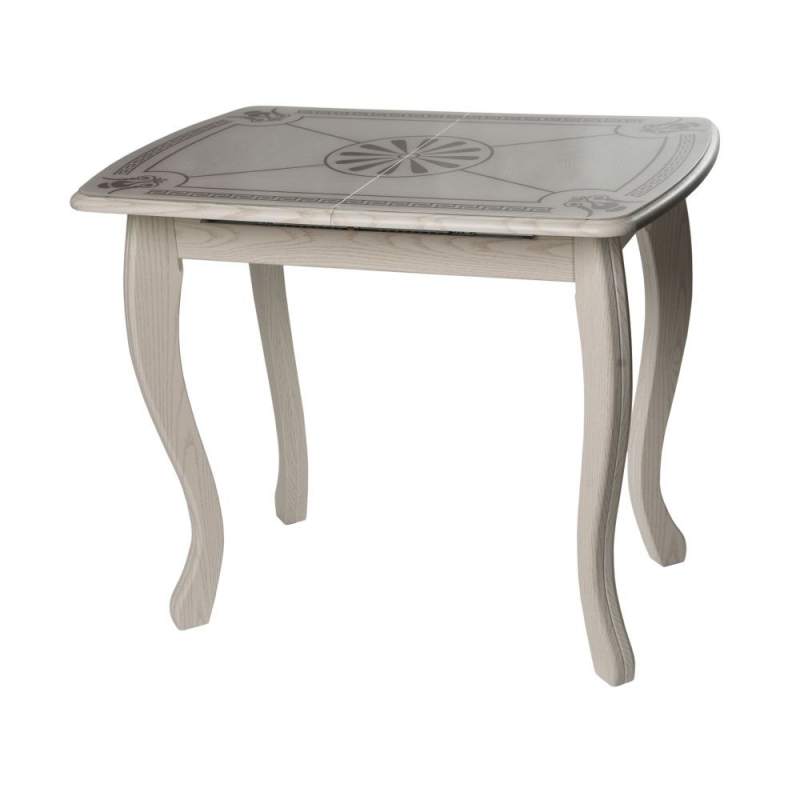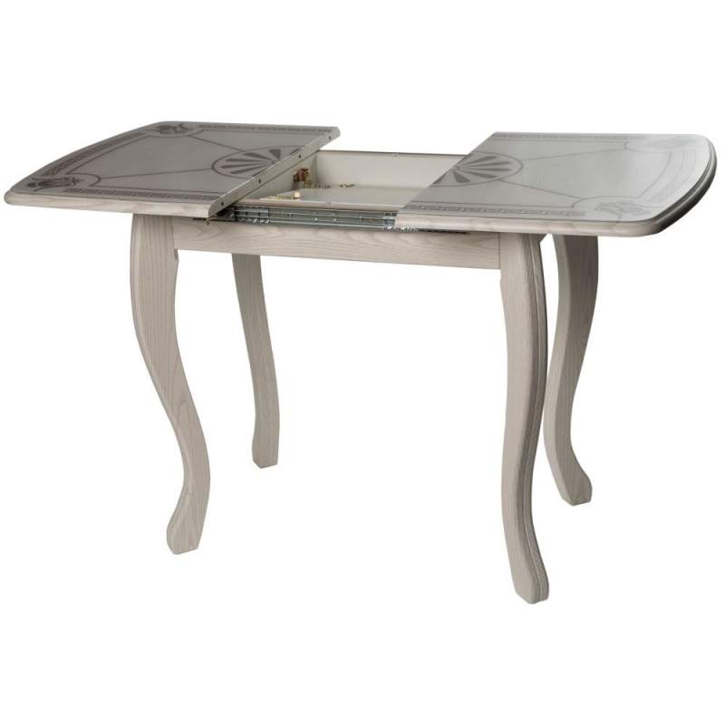 Стол кухонный «Альба мини» М58 (ДП1-02-06), с каркасом из МДФ, инкрустация-2, патина 25. Поверхность столешницы покрыта закаленным стеклом, и керамической краской, толщиной 22 мм.