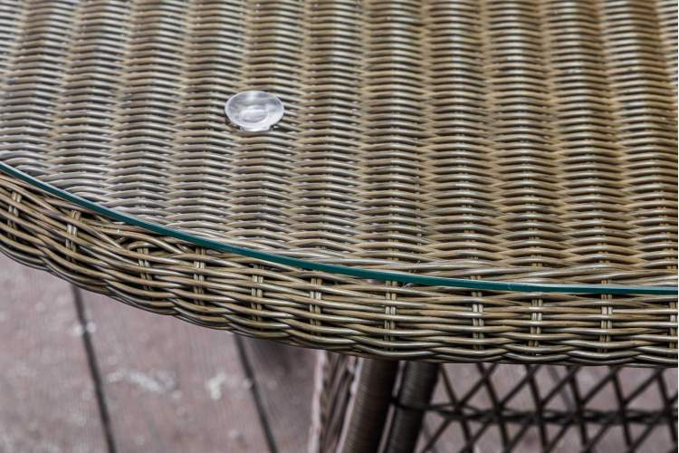 Столешница оплетена ротангом и сверху лежит прозрачное закаленное стекло