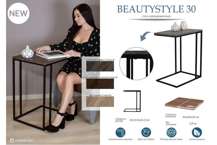 Придиванный столик BeautyStyle 30 станет отличным дополнением современного интерьера дома или квартиры. Деревянная столешница выполнена из МДФ и покрыта защитной плёнкой, предотвращающей возможные повреждения. Металлический каркас обеспечивает прочность и устойчивость изделия. Прямоугольная форма и четкие линии делают модель предметом с нескончаемыми возможностями использования.