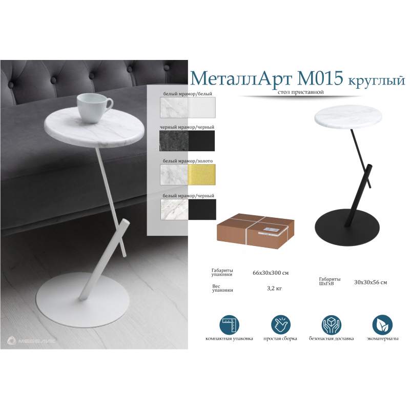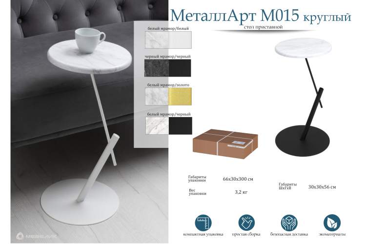 Приобрести Стол приставной круглый МеталлАрт М015 белый мрамор/белый в интернет-магазине недорого по цене 3955р.. Нажав кнопку ХОЧУ СКИДКУ - оператор предложит лучшую цену если это возможно. Доставка в Москве и области со сборкой сразу. Отправляем в регионы России. Для заказа Стол приставной круглый МеталлАрт М015 белый мрамор/белый 009508-09 009508 звоните по телефону: +7(495)642-45-92. Посмотреть Стол приставной круглый МеталлАрт М015 белый мрамор/белый от mebelik можно в каталоге.