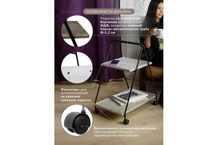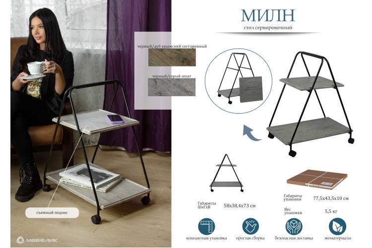 Универсальный сервировочный столик Милн обладает лаконичным дизайном, который подойдёт под современный интерьер квартиры или дома. Деревянные столешницы из МДФ качественно обработаны и покрыты пленкой, а каркас изделия выполнен из металлических трубок 12мм. Съемный квадратный поднос оснащён фиксаторами антискольжения, что исключает возможность опрокидывания и соскальзывания. Модель на колёсиках легко перемещать даже в небольшом пространстве. Многофункциональный стол можно использовать как приставной, кофейный, журнальный или книжный.