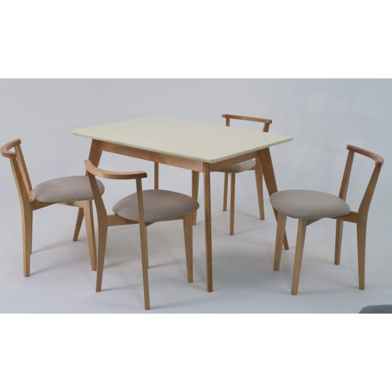 Комплект из деревянного стола Сканди на каркасе из натурального дерева и 4 стула Франк отлично подойдет к интерьеру, выдержанному в скандинавском стиле. Данный комплект станет центральным элементом в гостиной, столовой зоне, на кухне, позволив создать уютное обеденное место, где смогут собираться члены дружной семьи и их гости.У модели прямоугольная форма столешницы, со скруглением углов. Такое решение исключит риск сколов и обеспечит безопасность, в том числе, детям.Комплект выполнен в красивй комбинации цветов - натур и слоновая кость. Сочетание изысканного дизайна и высокого качества исполнения - главная особенность комплекта.Столешница выполнена из материалов с великолепными эксплуатационными свойствами - МДФ (Материал создается на основе натуральной древесины. Практичен, надежен, имеет однородную гладкую структуру), шпон.Мебель проста в уходе - для поддержания первозданного вида достаточно использовать простую чуть влажную салфетку по мере необходимости.Состав комплекта: Стол F514102NUS 120x80x75 и 4 стула R101707N02 44x53x73
