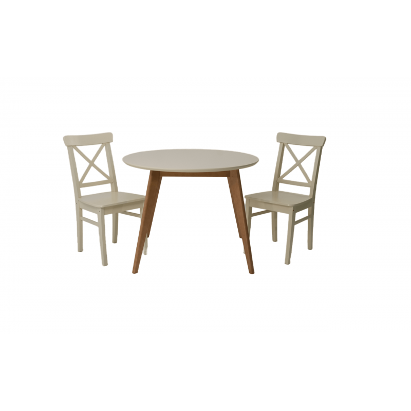 Комплект из деревянного стола Сканди на каркасе из натурального дерева и 2 стула Ингольф отлично подойдет к интерьеру, выдержанному в скандинавском стиле. Данный комплект станет центральным элементом в гостиной, столовой зоне, на кухне, позволив создать уютное обеденное место, где смогут собираться члены дружной семьи и их гости.У модели круглая форма столешницы. Такое решение исключит риск сколов и обеспечит безопасность, в том числе, детям.Комплект выполнен в красивой комбинации цветов - орех, слоновая кость. Сочетание изысканного дизайна и высокого качества исполнения - главная особенность комплекта.Столешница выполнена из материалов с великолепными эксплуатационными свойствами - МДФ (Материал создается на основе натуральной древесины. Практичен, надежен, имеет однородную гладкую структуру), шпон.Мебель проста в уходе - для поддержания первозданного вида достаточно использовать простую чуть влажную салфетку по мере необходимости.Состав комплекта:- стол F004102NUS- стулья R100741S00