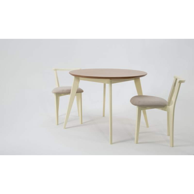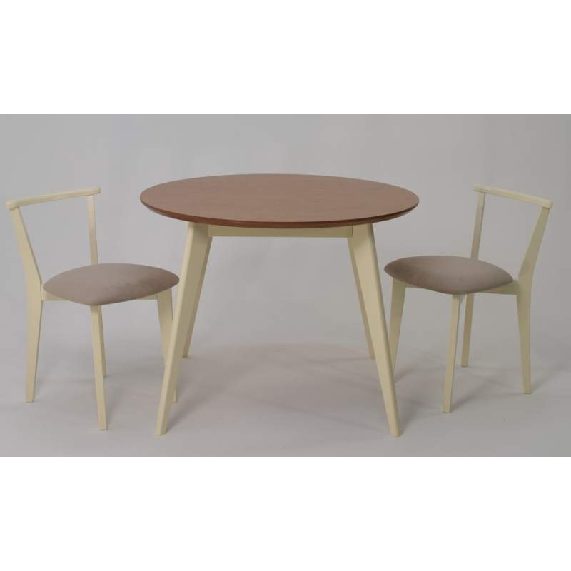 Комплект из деревянного стола Сканди на каркасе из натурального дерева и 2 стула Франк отлично подойдет к интерьеру, выдержанному в скандинавском стиле. Данный комплект станет центральным элементом в гостиной, столовой зоне, на кухне, позволив создать уютное обеденное место, где смогут собираться члены дружной семьи и их гости.У модели круглая форма столешницы. Такое решение исключит риск сколов и обеспечит безопасность, в том числе, детям.Комплект выполнен в красивой комбинации цветов - орех, слоновая кость. Сочетание изысканного дизайна и высокого качества исполнения - главная особенность комплекта.Столешница выполнена из материалов с великолепными эксплуатационными свойствами - МДФ (Материал создается на основе натуральной древесины. Практичен, надежен, имеет однородную гладкую структуру), шпон.Мебель проста в уходе - для поддержания первозданного вида достаточно использовать простую чуть влажную салфетку по мере необходимости.Состав комплекта:- стол F004104SUN- стулья R101709S02