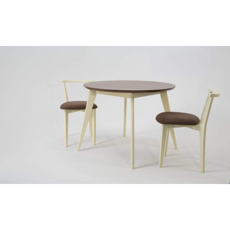 Комплект из деревянного стола Сканди на каркасе из натурального дерева и 2 стула Франк отлично подойдет к интерьеру, выдержанному в скандинавском стиле. Данный комплект станет центральным элементом в гостиной, столовой зоне, на кухне, позволив создать уютное обеденное место, где смогут собираться члены дружной семьи и их гости.У модели круглая форма столешницы. Такое решение исключит риск сколов и обеспечит безопасность, в том числе, детям.Комплект выполнен в красивой комбинации цветов - орех, слоновая кость. Сочетание изысканного дизайна и высокого качества исполнения - главная особенность комплекта.Столешница выполнена из материалов с великолепными эксплуатационными свойствами - МДФ (Материал создается на основе натуральной древесины. Практичен, надежен, имеет однородную гладкую структуру), шпон.Мебель проста в уходе - для поддержания первозданного вида достаточно использовать простую чуть влажную салфетку по мере необходимости.Состав комплекта:- стол F004103SUW- стулья R101709S04