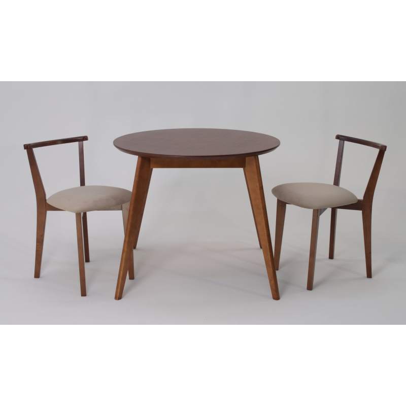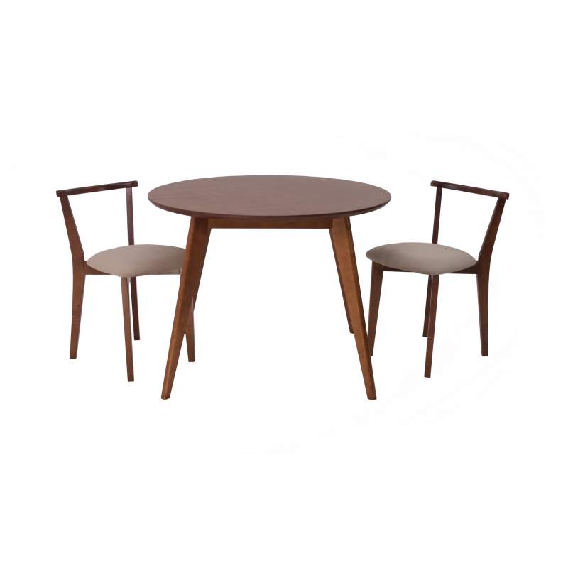 Комплект из деревянного стола Сканди на каркасе из натурального дерева и 2 стула Франк отлично подойдет к интерьеру, выдержанному в скандинавском стиле. Данный комплект станет центральным элементом в гостиной, столовой зоне, на кухне, позволив создать уютное обеденное место, где смогут собираться члены дружной семьи и их гости.У модели круглая форма столешницы. Такое решение исключит риск сколов и обеспечит безопасность, в том числе, детям.Комплект выполнен в красивом цвете - орех. Сочетание изысканного дизайна и высокого качества исполнения - главная особенность комплекта.Столешница выполнена из материалов с великолепными эксплуатационными свойствами - МДФ (Материал создается на основе натуральной древесины. Практичен, надежен, имеет однородную гладкую структуру), шпон.Мебель проста в уходе - для поддержания первозданного вида достаточно использовать простую чуть влажную салфетку по мере необходимости.Состав комплекта:- стол F004115W00- стулья R101706W02