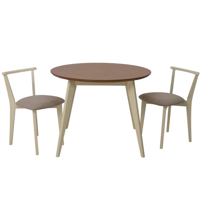 Комплект из деревянного стола Сканди на каркасе из натурального дерева и 2 стула Франк отлично подойдет к интерьеру, выдержанному в скандинавском стиле. Данный комплект станет центральным элементом в гостиной, столовой зоне, на кухне, позволив создать уютное обеденное место, где смогут собираться члены дружной семьи и их гости.У модели круглая форма столешницы. Такое решение исключит риск сколов и обеспечит безопасность, в том числе, детям.Комплект выполнен в красивой комбинации цветов - орех, слоновая кость. Сочетание изысканного дизайна и высокого качества исполнения - главная особенность комплекта.Столешница выполнена из материалов с великолепными эксплуатационными свойствами - МДФ (Материал создается на основе натуральной древесины. Практичен, надежен, имеет однородную гладкую структуру), шпон.Мебель проста в уходе - для поддержания первозданного вида достаточно использовать простую чуть влажную салфетку по мере необходимости.Состав комплекта:- стол F004114SUN- стулья R101709S02