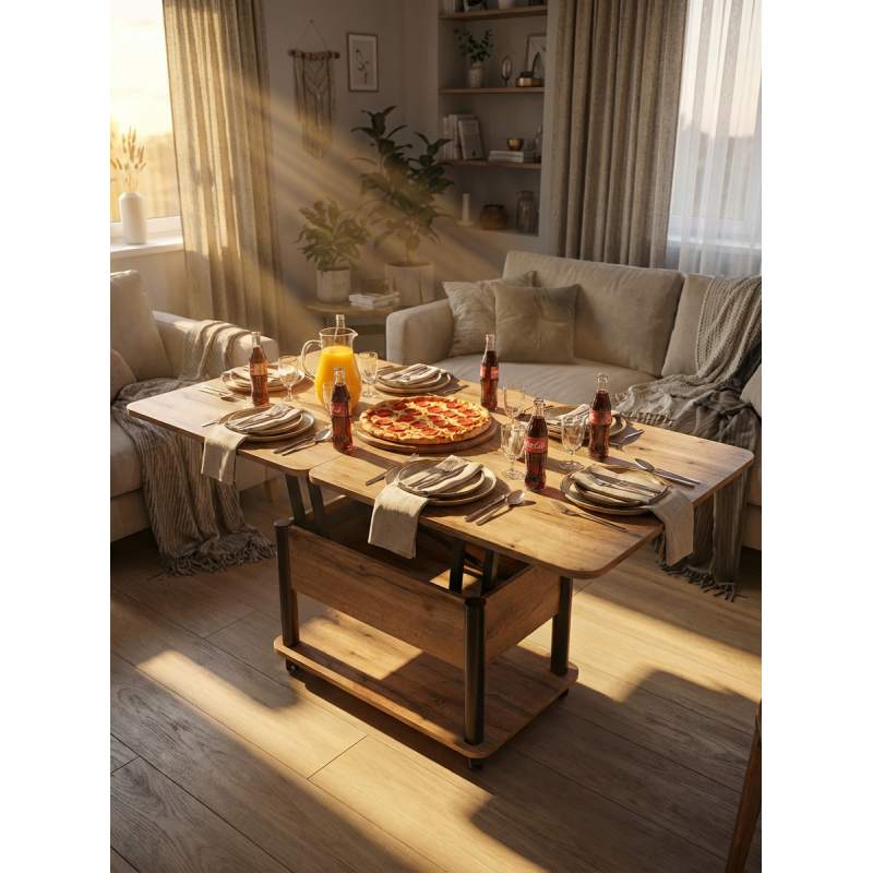 Стол трансформер Джокер — универсальное решение для дома и офиса, где важны практичность и эстетика. Благодаря колёсикам с фиксацией стол легко перемещать и надёжно закреплять на месте. Прочная столешница из ЛДСП (22 мм) с тремя соединительными петлями гарантирует долговечность и устойчивость к нагрузкам. Усиленный механизм трансформации исключает шатание в любом положении. В сложенном виде это компактный журнальный стол, а в разложенном — обеденный, рассчитанный на 8 человек. Универсальный дизайн позволяет использовать стол для семейных ужинов, дружеских встреч или работы, делая его полноценным и функциональным элементом интерьера.
