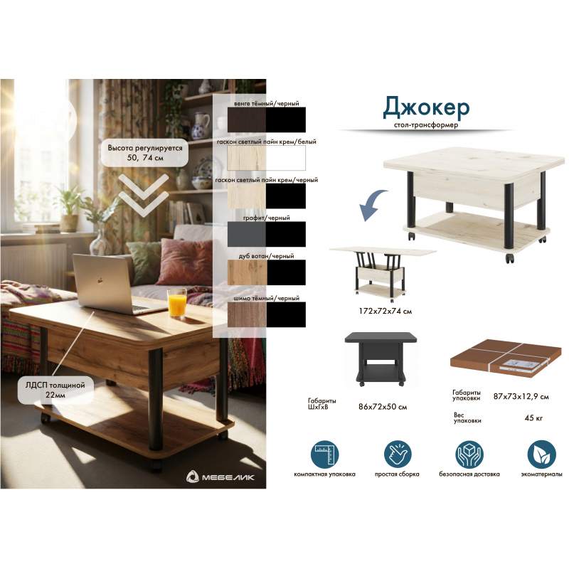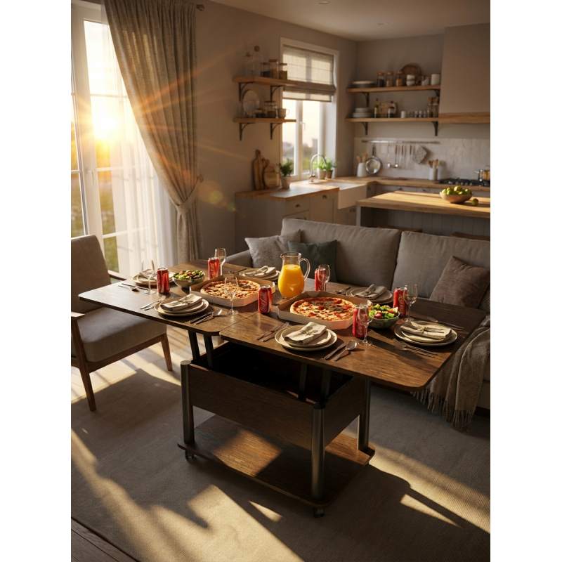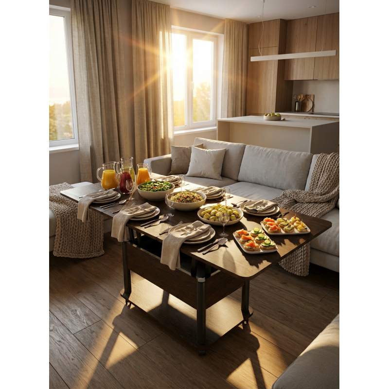 Стол трансформер Джокер — универсальное решение для дома и офиса, где важны практичность и эстетика. Благодаря колёсикам с фиксацией стол легко перемещать и надёжно закреплять на месте. Прочная столешница из ЛДСП (22 мм) с тремя соединительными петлями гарантирует долговечность и устойчивость к нагрузкам. Усиленный механизм трансформации исключает шатание в любом положении. В сложенном виде это компактный журнальный стол, а в разложенном — обеденный, рассчитанный на 8 человек. Универсальный дизайн позволяет использовать стол для семейных ужинов, дружеских встреч или работы, делая его полноценным и функциональным элементом интерьера.
