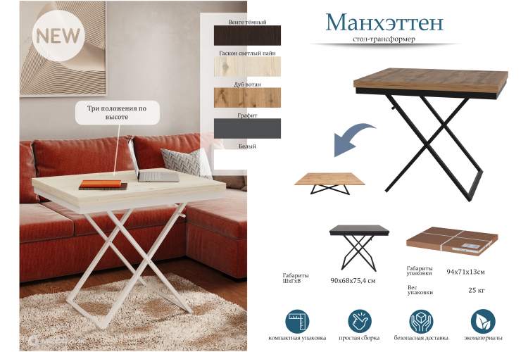 Стол-трансформер Манхэттен - практичная мебель для современного интерьера. Он превращается из компактного журнального 900х680 мм в обеденный стол 1360х900 мм. Надежная столешница из ЛДСП толщиной 16 мм в сочетании с прочным металлическими опорами, сечением 30х20 мм, гарантируют надежность и устойчивость. Металлический царговый пояс обеспечивает долговечность конструкции, позволяя выдерживать значительные нагрузки при ежедневном и многократном использовании.