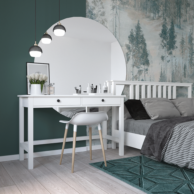 Стол туалетный с двумя выдвижными ящиками в верхней части Ф-156.08, 750х1200х470, цвет Белый. На задней части столешницы имеется открывающаяся планка, под которой ниша с отверстием под провода.Благодаря компактной конструкции, стол может использоваться и как туалетный, и как письменный. Изготовлен из массива сосны. Гарантийный срок для жилых помещений 24 месяца, для общественных помещений - 18 месяцев.