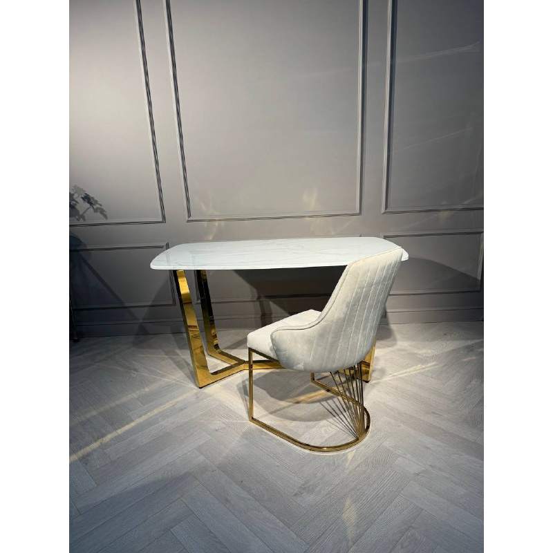 Каркас выполнен из прочной нержавеющей стали с глянцевым золотым покрытием, что гарантирует долговечность изделия и его устойчивость к коррозии. Золотые ножки придают модели торжественный вид и делают ее универсальной для различных интерьерных решений.