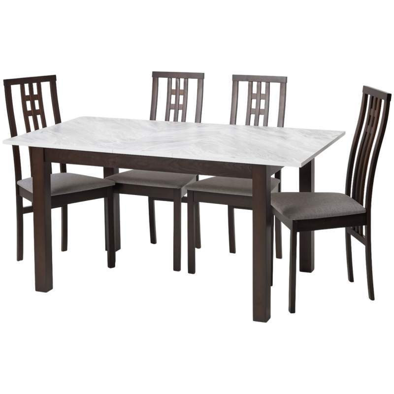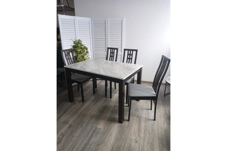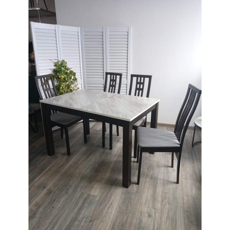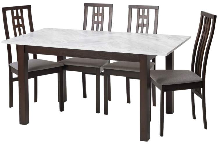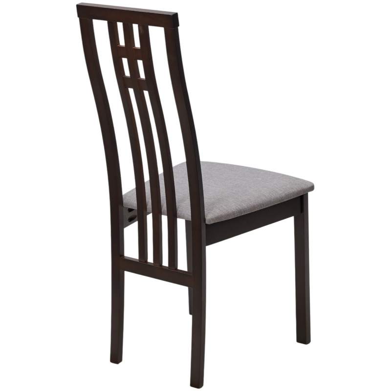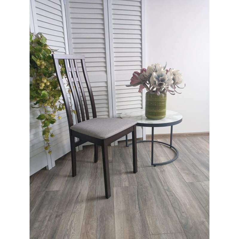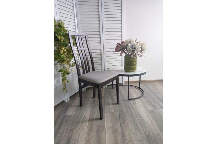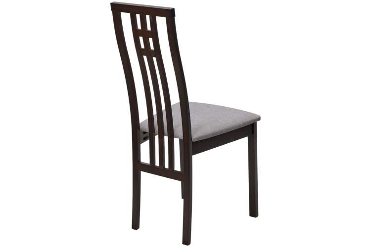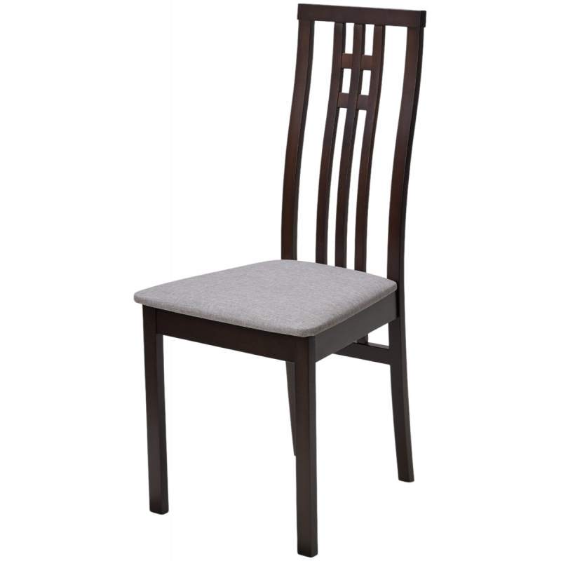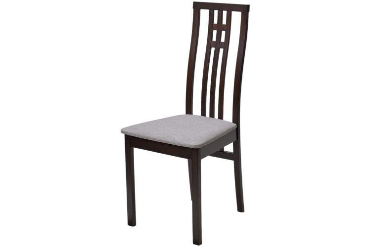 Каркас стула выполнен из массива бука в цвете темный орех, сиденье обито тканью.