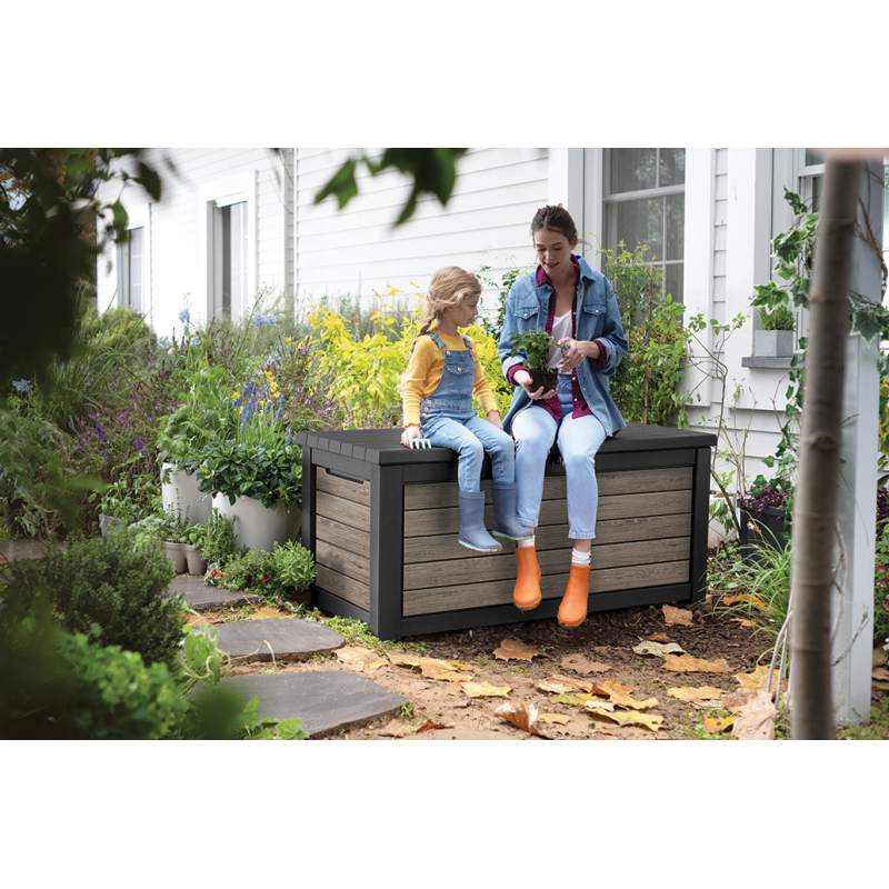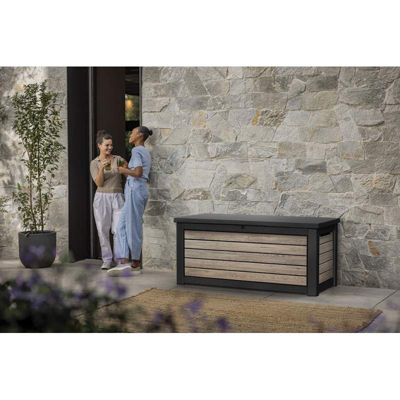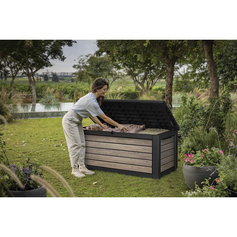 Практичная система с приводами обеспечивает плавное и лёгкое открывание и закрывание крышки. Впечатляющий объём 630 литров предлагает достаточно места для хранения садовых принадлежностей, подушек и других предметов. Кроме того, для дополнительной безопасности контейнер можно запереть навесным замком (не входит в комплект).