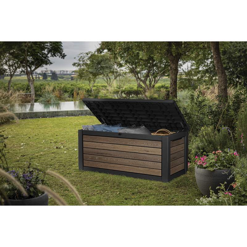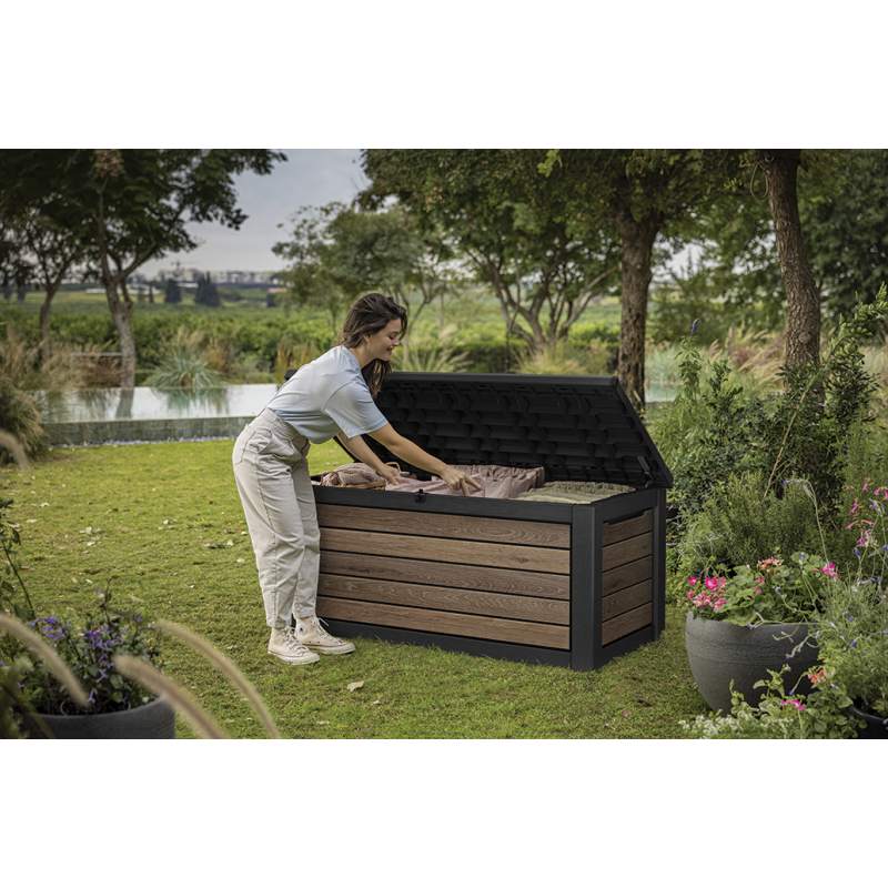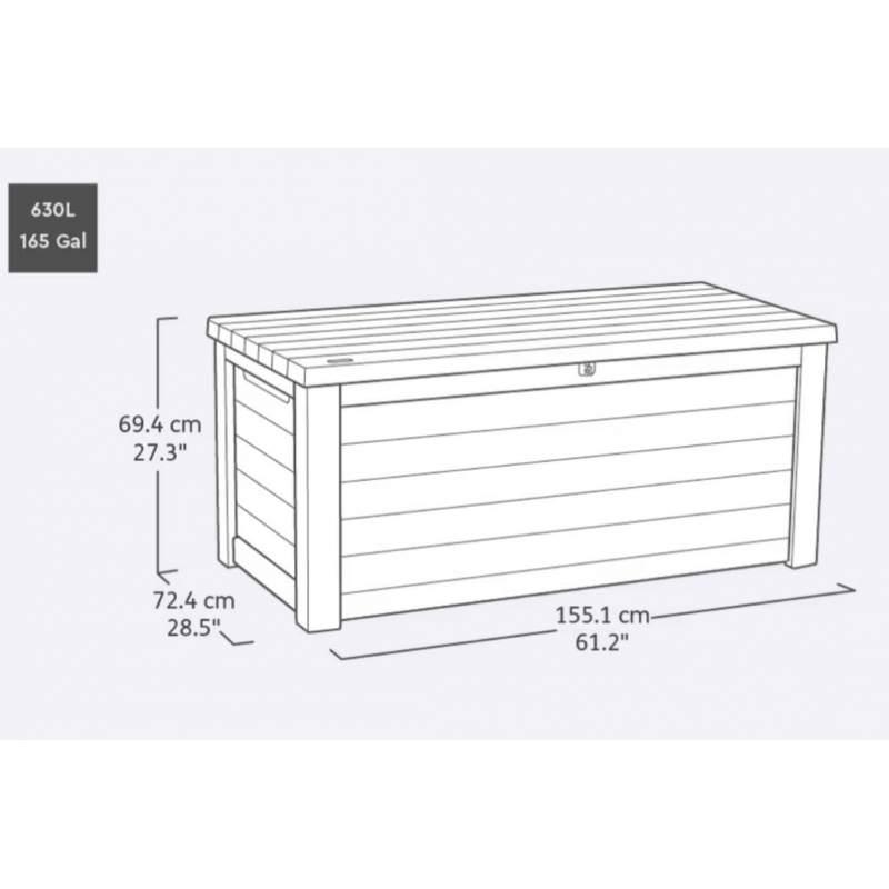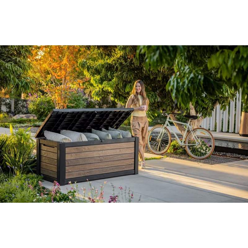 Практичная система с приводами обеспечивает плавное и лёгкое открывание и закрывание крышки. Впечатляющий объём 630 литров предлагает достаточно места для хранения садовых принадлежностей, подушек и других предметов. Кроме того, для дополнительной безопасности контейнер можно запереть навесным замком (не входит в комплект).