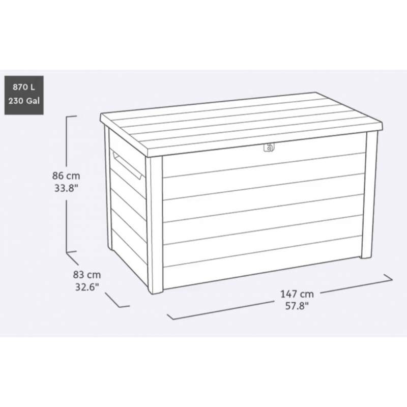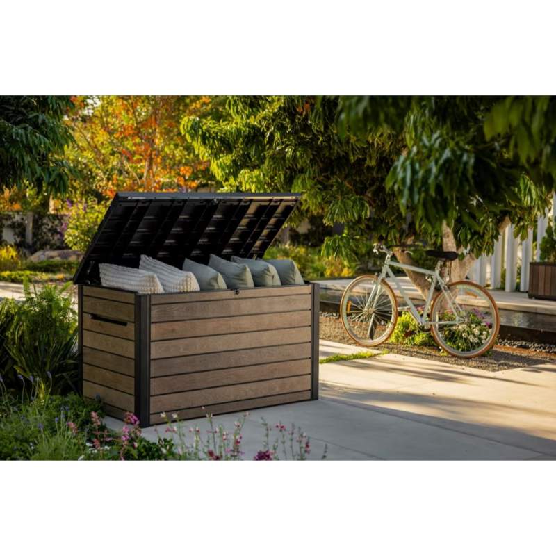 Удобная система с приводами обеспечивает плавное и лёгкое открывание и закрывание крышки. Благодаря впечатляющему объёму в 870 литров, он вместит все необходимые садовые принадлежности, подушки и многое другое. Кроме того, высокая функциональность контейнера позволяет запирать его на навесной замок (не входит в комплект) для ещё большей безопасности.