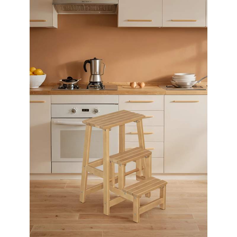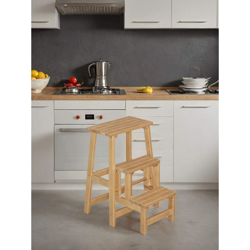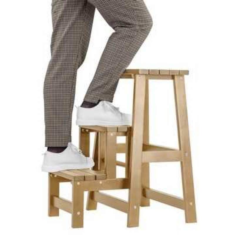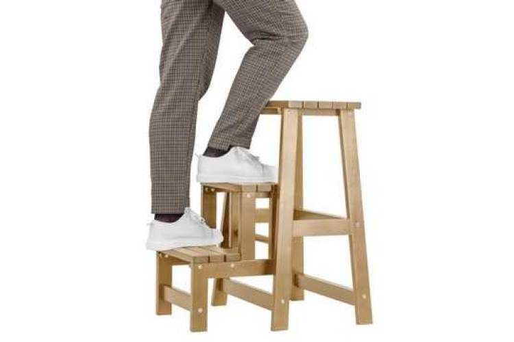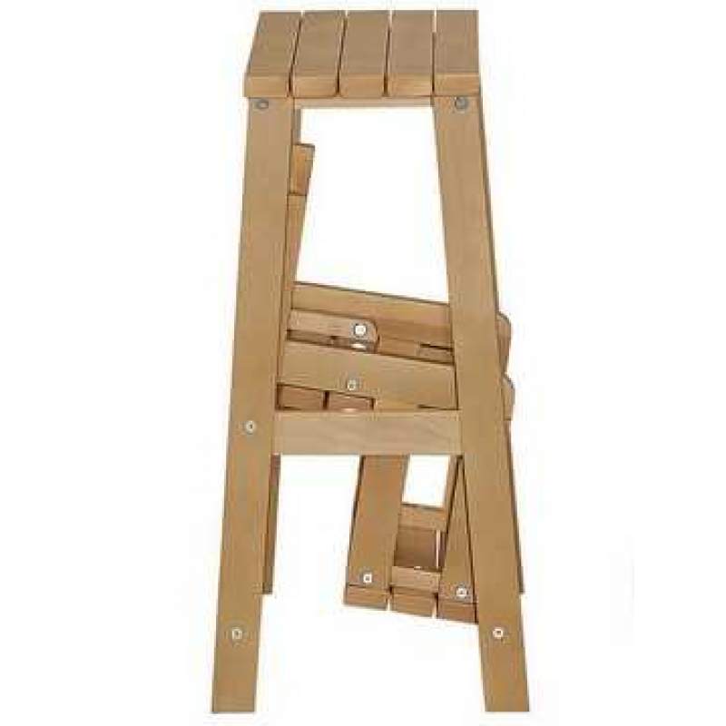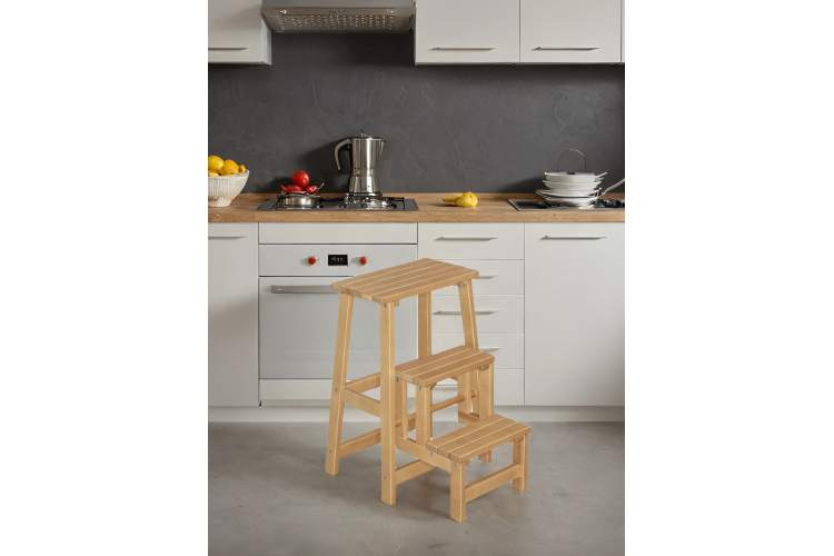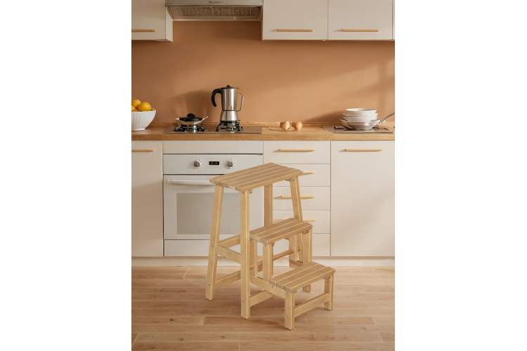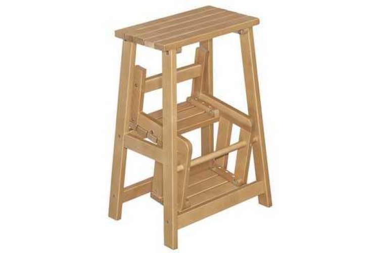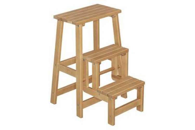 Высокий табурет (обратите внимание на высоту сиденья в характеристиках), одновременно и небольшая стремянка на три ступени. Вещь незаменимая в современных кухнях. Высоко расположенные вместительные навесные ящики часто оказываются недоступными для домохозяек именно из-за высоты. Даже обычного табурета иногда не хватает для того, чтобы дотянуться до нужных вещей на верхних полках. Стремянка в разобранном виде позволяет достать рукой до потолка в квартире человеку даже не самого большого роста. В собранном виде – дополнительное место для сидения и не бросается в глаза. Несколько вариантов цветов позволяют подобрать наиболее подходящий в вашу кухню. Каркас из натурального дерева делает стремянку легкой и прочной. Отличное приобретение, может служить подарком хозяйке.