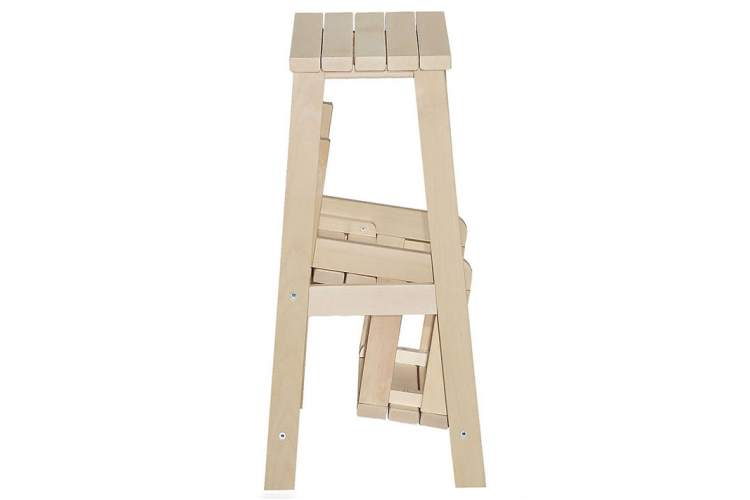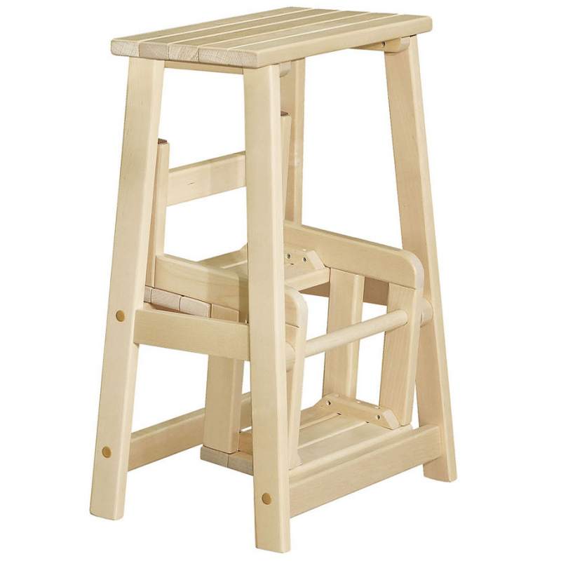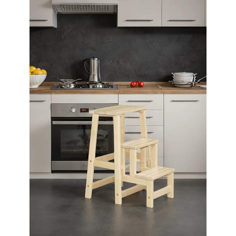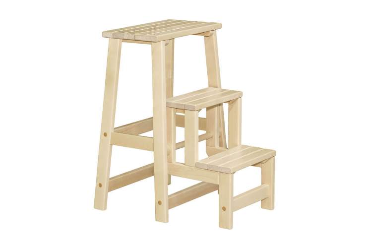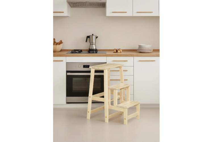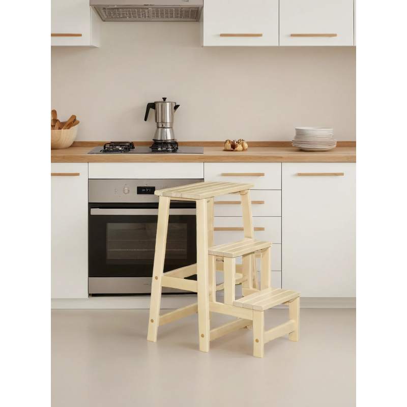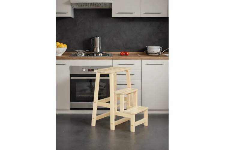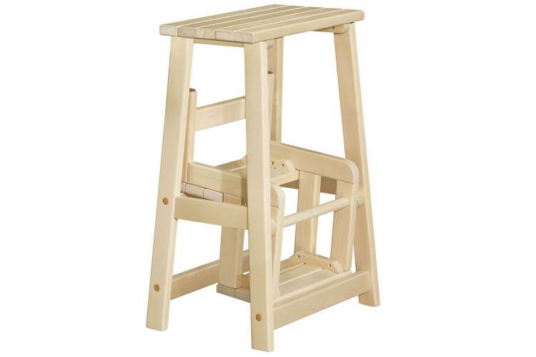 Высокий табурет (обратите внимание на высоту сиденья в характеристиках), одновременно и небольшая стремянка на три ступени. Вещь незаменимая в современных кухнях. Высоко расположенные вместительные навесные ящики часто оказываются недоступными для домохозяек именно из-за высоты. Даже обычного табурета иногда не хватает для того, чтобы дотянуться до нужных вещей на верхних полках. Стремянка в разобранном виде позволяет достать рукой до потолка в квартире человеку даже не самого большого роста. В собранном виде – дополнительное место для сидения и не бросается в глаза. Несколько вариантов цветов позволяют подобрать наиболее подходящий в вашу кухню. Каркас из натурального дерева делает стремянку легкой и прочной. Отличное приобретение, может служить подарком хозяйке.