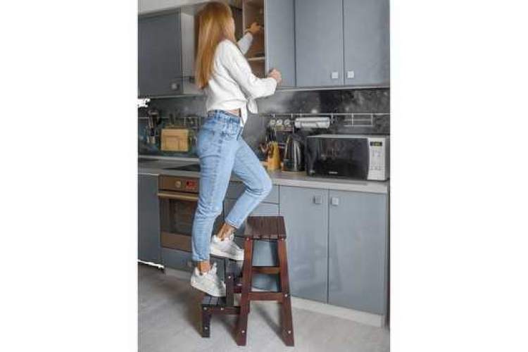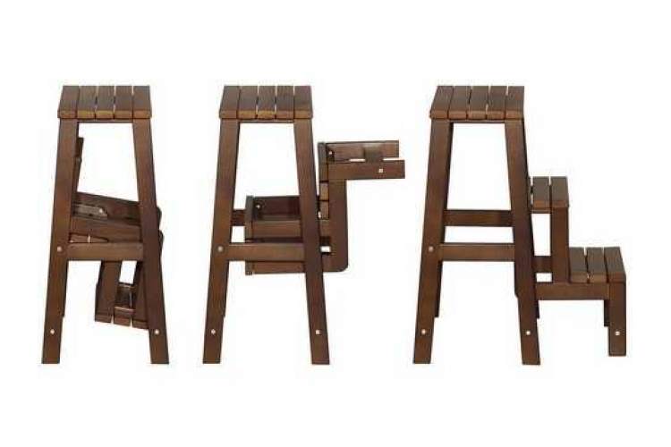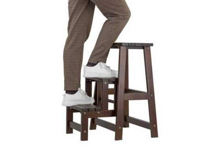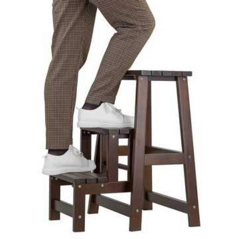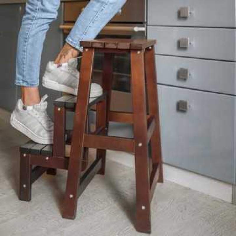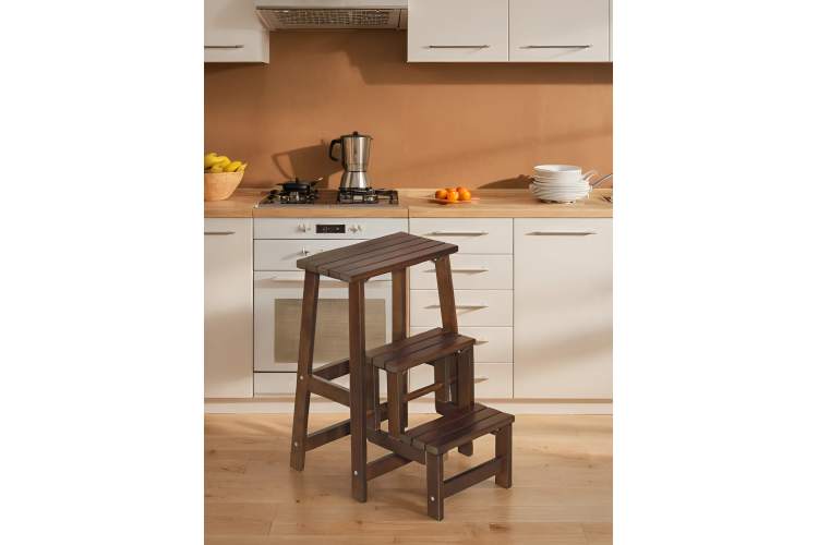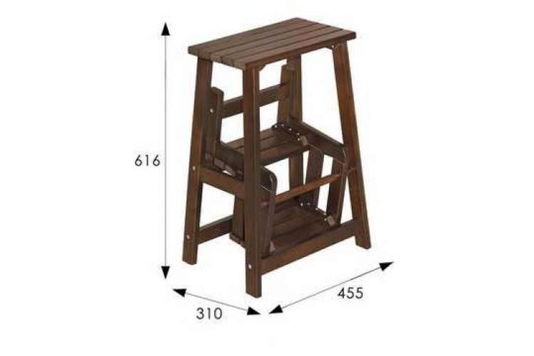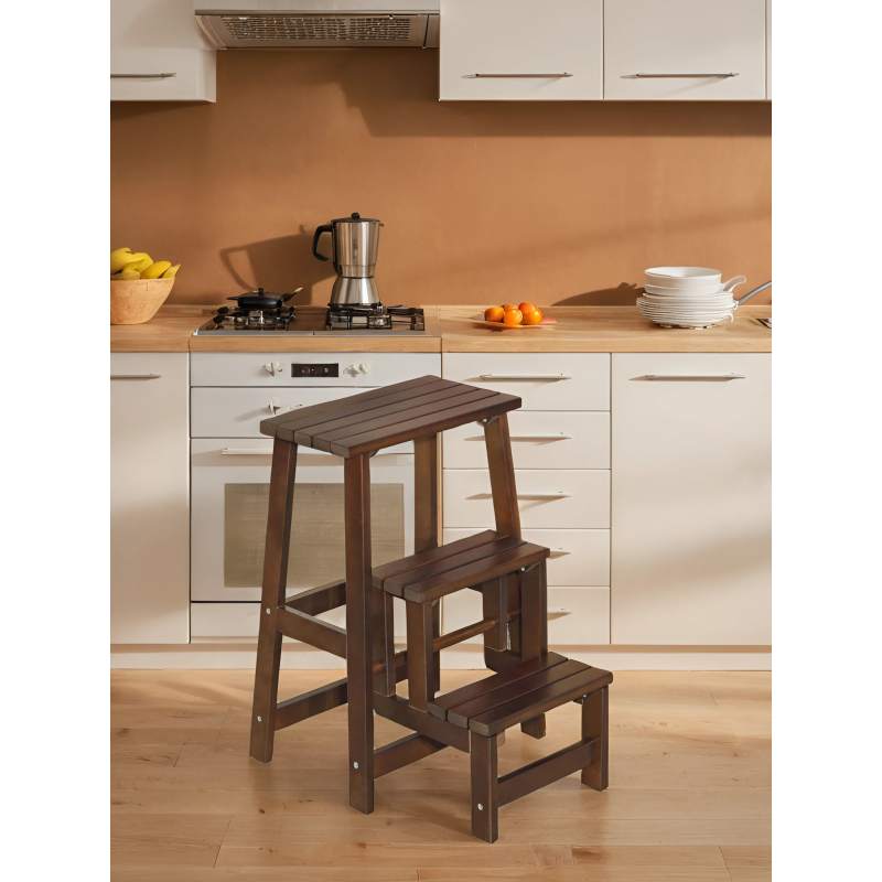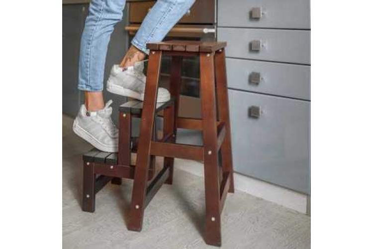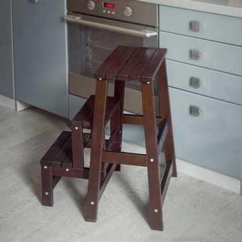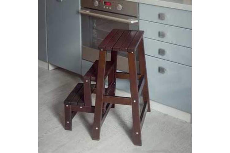 Высокий табурет (обратите внимание на высоту сиденья в характеристиках), одновременно и небольшая стремянка на три ступени. Вещь незаменимая в современных кухнях. Высоко расположенные вместительные навесные ящики часто оказываются недоступными для домохозяек именно из-за высоты. Даже обычного табурета иногда не хватает для того, чтобы дотянуться до нужных вещей на верхних полках. Стремянка в разобранном виде позволяет достать рукой до потолка в квартире человеку даже не самого большого роста. В собранном виде – дополнительное место для сидения и не бросается в глаза. Несколько вариантов цветов позволяют подобрать наиболее подходящий в вашу кухню. Каркас из натурального дерева делает стремянку легкой и прочной. Отличное приобретение, может служить подарком хозяйке.
