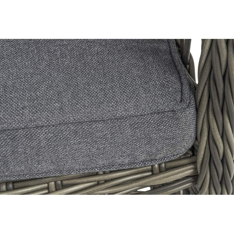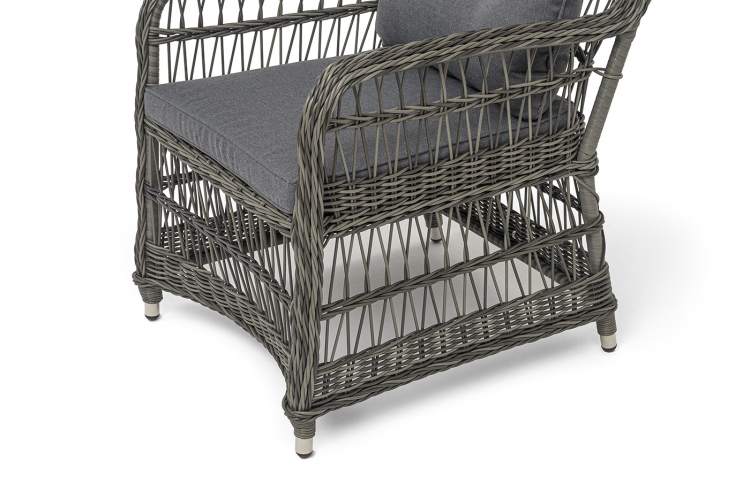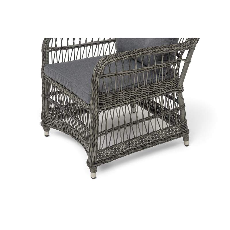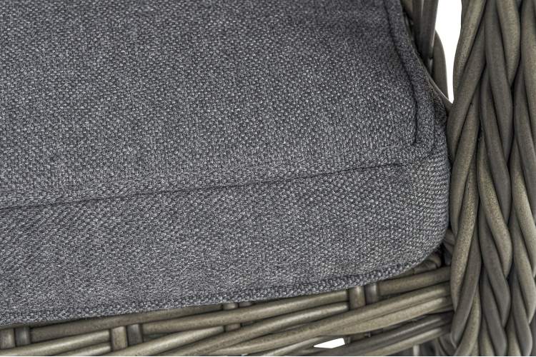 Кресло «Цесена» имеет практичные подлокотники для удобного размещения во время отдыха. Алюминиевый каркас находится в основе мебели. Он характеризуется устойчивостью и высокой прочностью. Задекорирован ручной круглой оплеткой, которая сделана из искусственного ротанга. Представлена в графитовом оттенке. Садовое кресло располагает двумя мягкими подушками, которые идут в комплекте. Они выполнены в сером цвете. Полиэстер высокого качества используется при пошиве тканевых изделий. Его плотность 300гр/м2. Ткань обрабатывается влагоотталкивающей пропиткой. Размер модели – 620×800×910 мм.