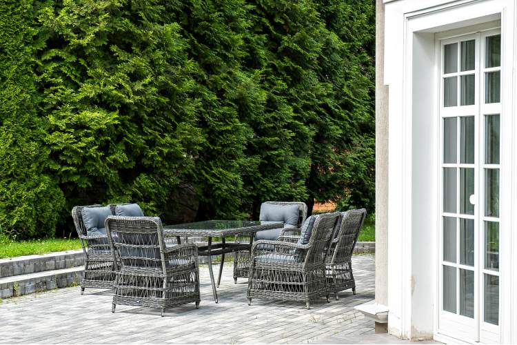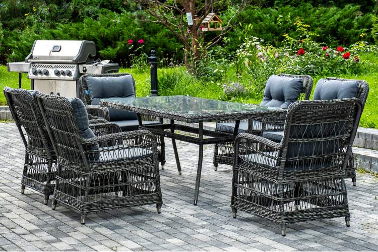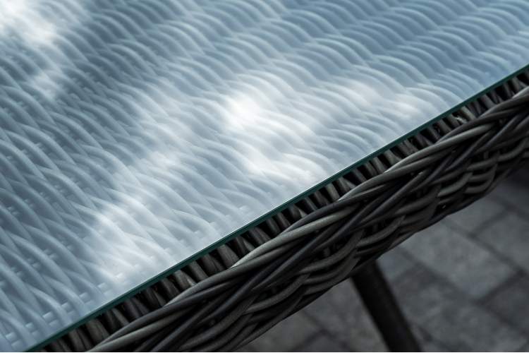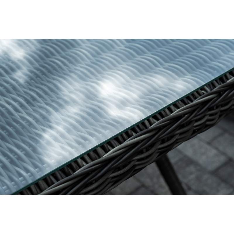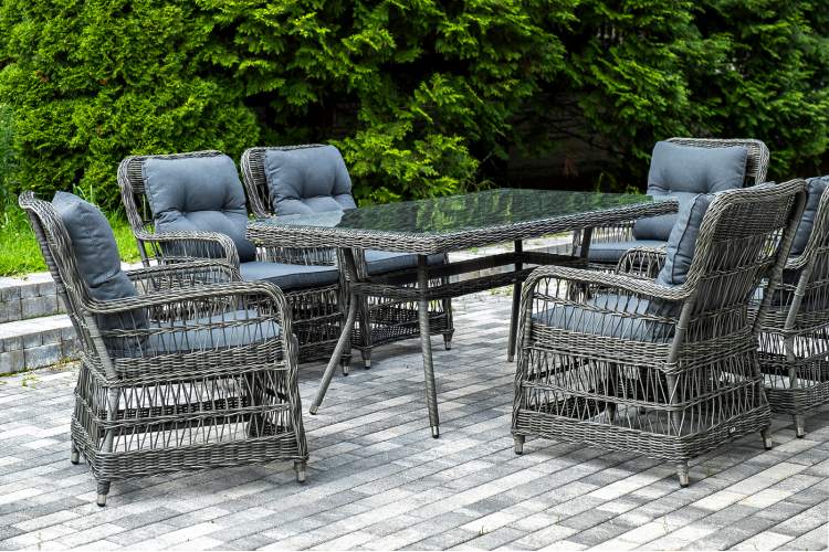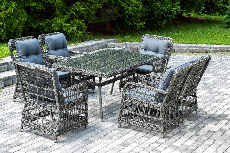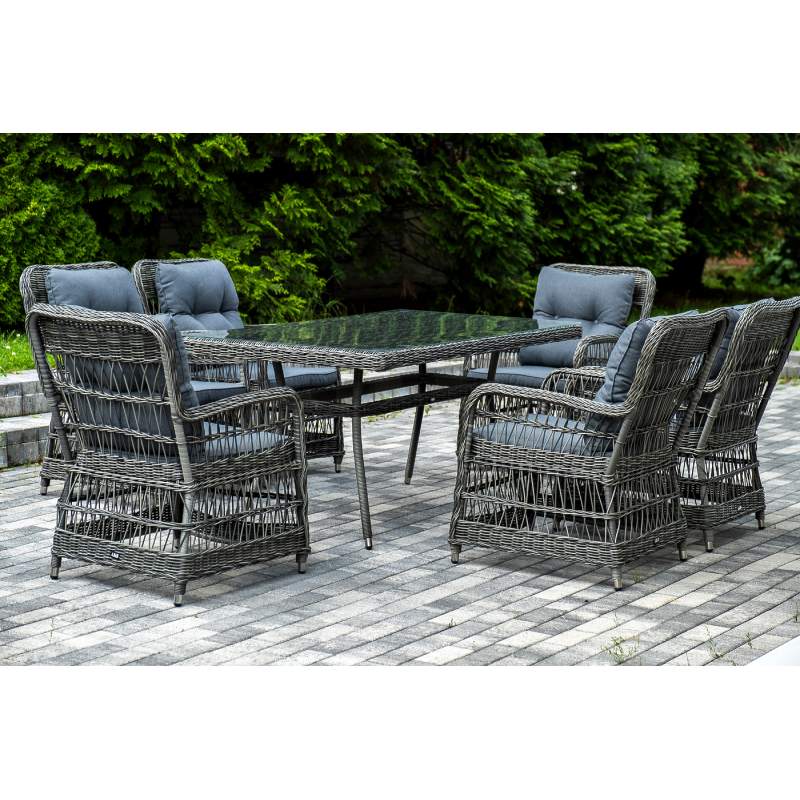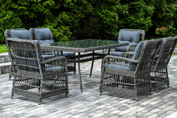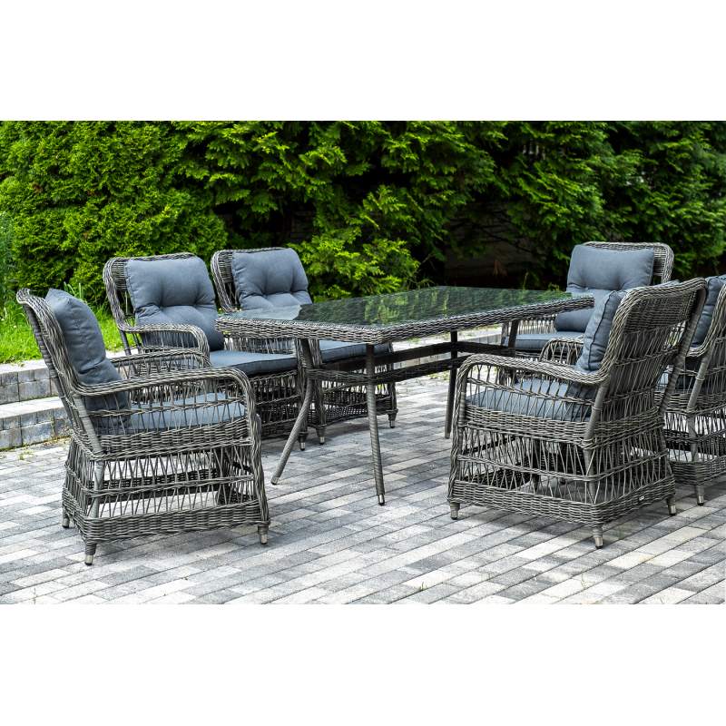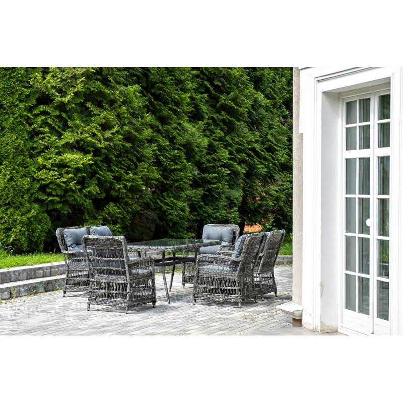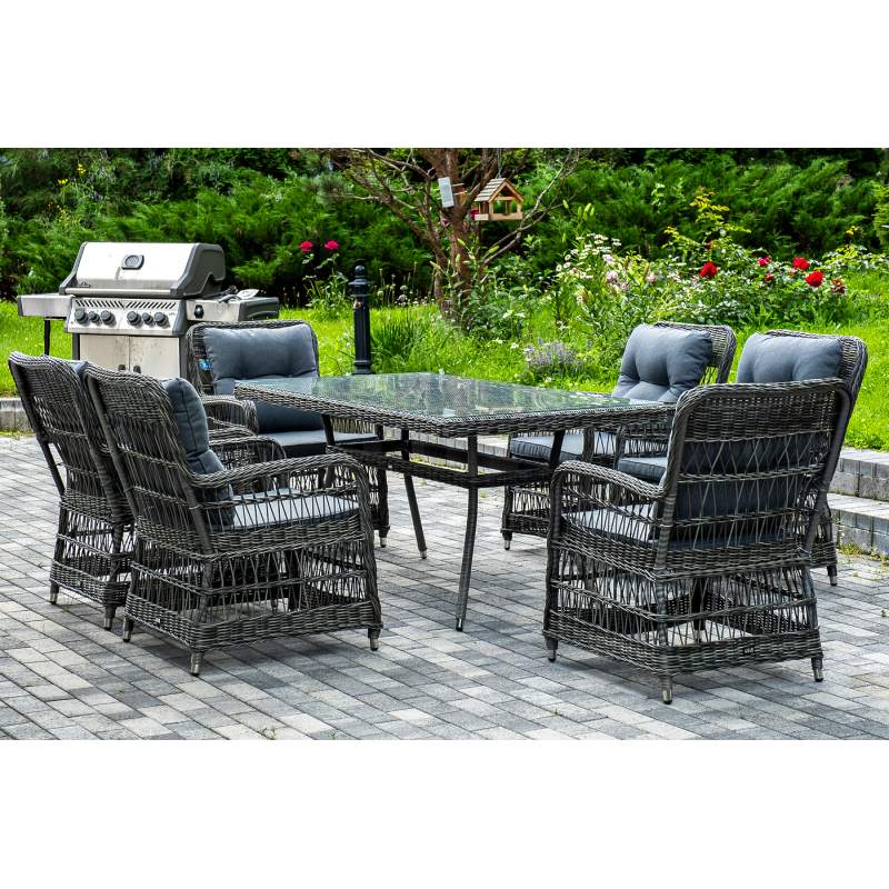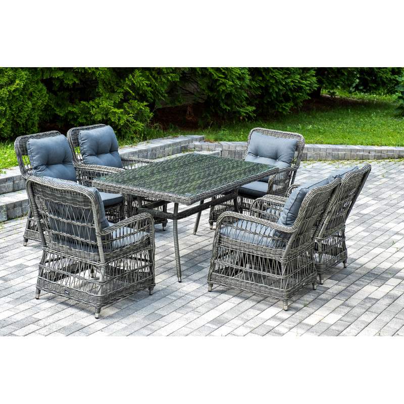 Садовая обеденная группа на 6 персон «Цесена» из ротанга. В комплекте: большой прямоугольный обеденный стол (1600×900×750 мм) и 6 кресел (600×800×910 мм). Вся мебель изготовлена из алюминия, вручную оплетенного круглым искусственным ротангом графитового оттенка. Столешница укомплектована ударопрочным стеклом, толщиной 5 мм. Данное стекло крепится к столу при помощи четырех вакуумных силиконовых присосок и поставляется в собранном виде. "Цесена" кресло плетеное из искусственного ротанга, цвет графит 6шт. 600Х800Х910, "Латте" плетеный стол из искусственного ротанга 160х90см, цвет графит 1шт. 1 600Х900Х750,