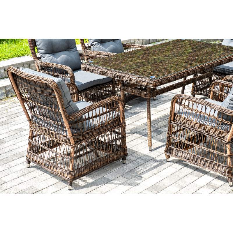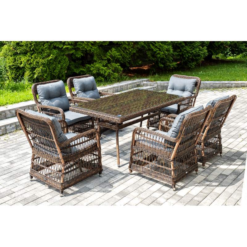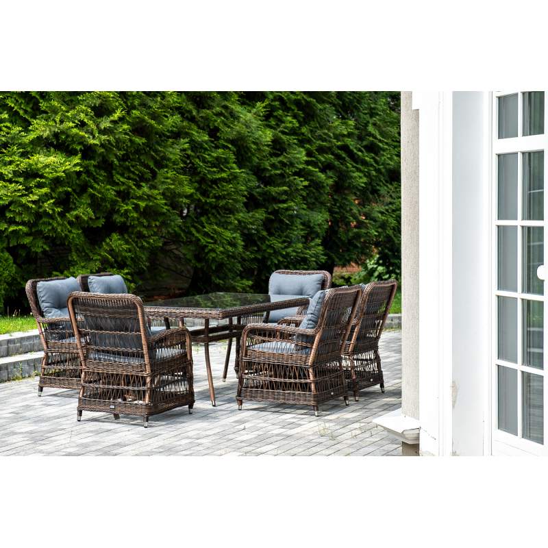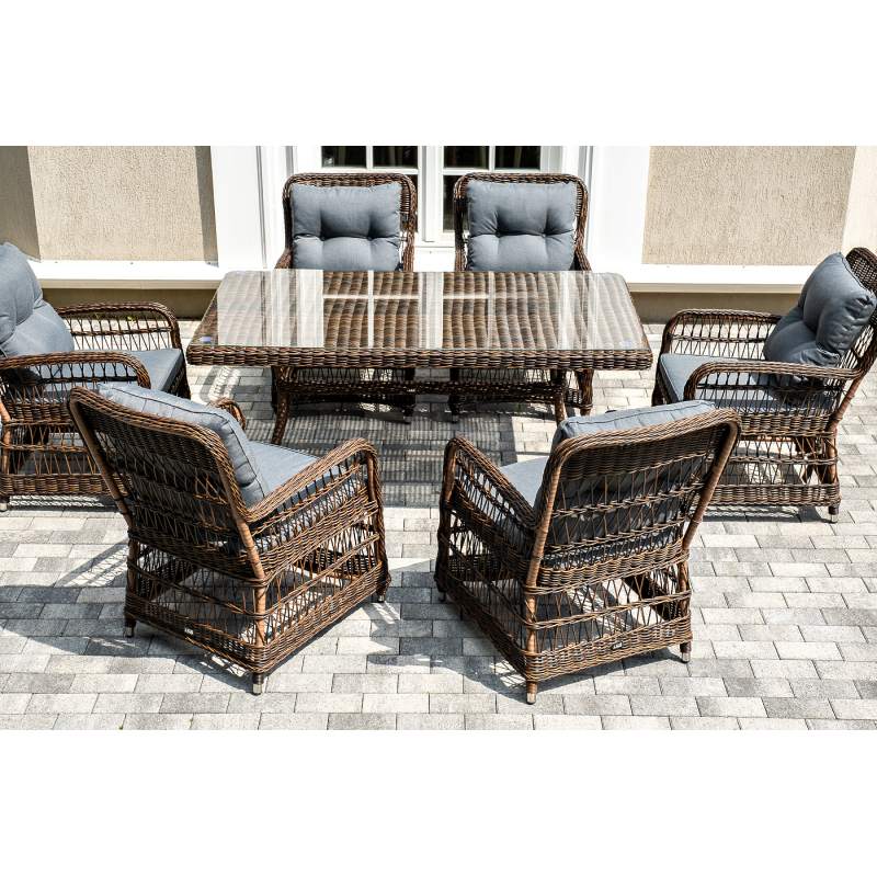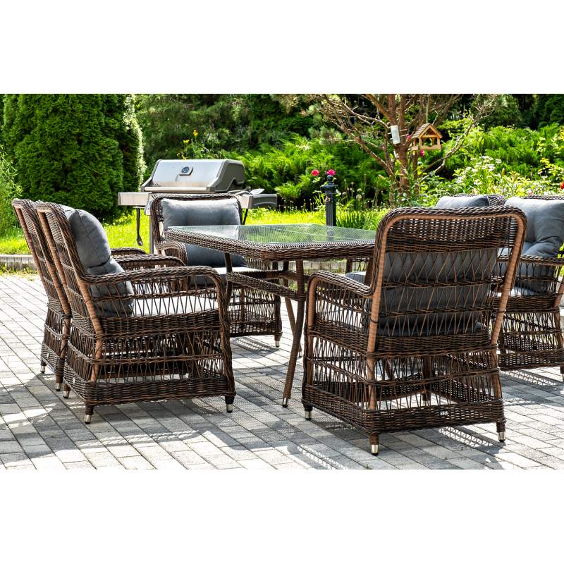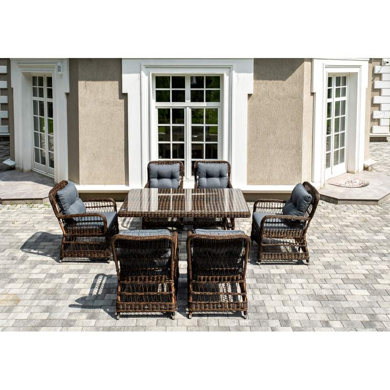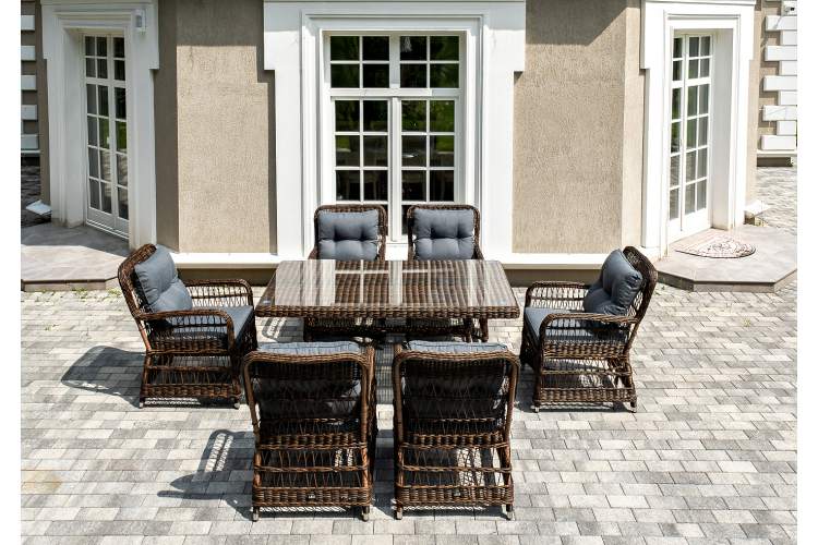 Садовая обеденная группа на 6 персон «Цесена» из ротанга. В комплекте: большой прямоугольный обеденный стол (1600×900×750 мм) и 6 кресел (600×800×910 мм). Вся мебель изготовлена из алюминия, вручную оплетенного круглым искусственным ротангом коричневого оттенка. Столешница укомплектована ударопрочным стеклом, толщиной 5 мм. Данное стекло крепится к столу при помощи четырех вакуумных силиконовых присосок и поставляется в собранном виде. "Цесена" кресло плетеное из искусственного ротанга, цвет коричневый 6шт. 600Х800Х910, "Латте" плетеный стол из искусственного ротанга 160х90см, цвет коричневый 1шт. 1 600Х900Х750,