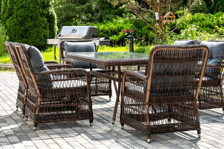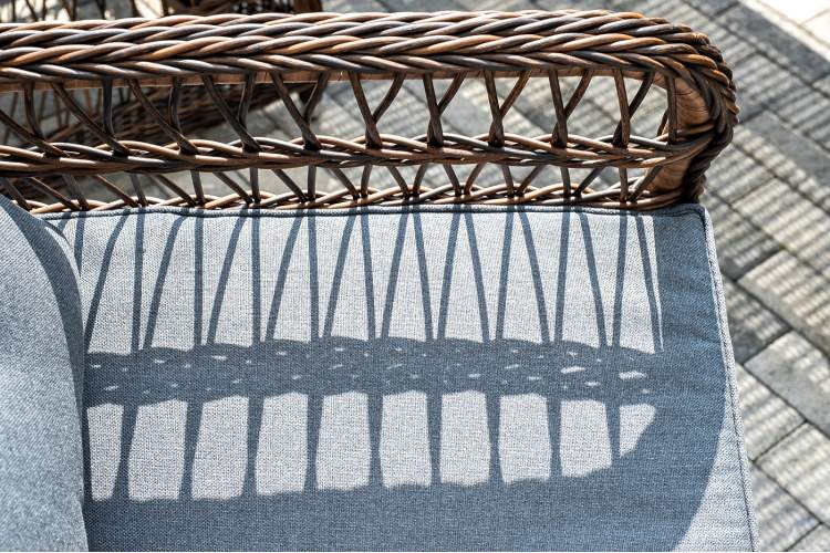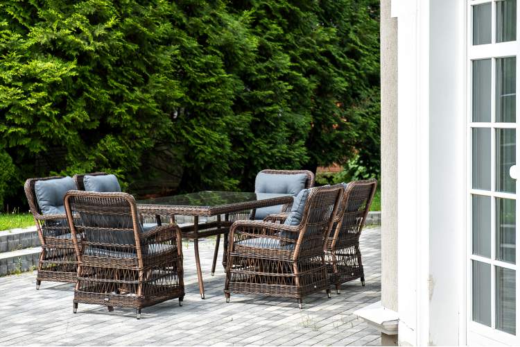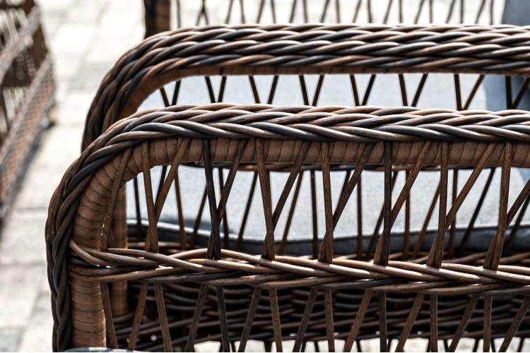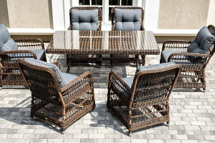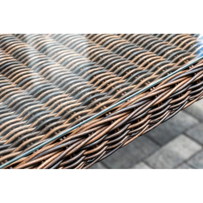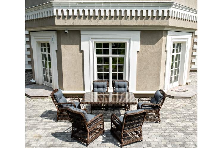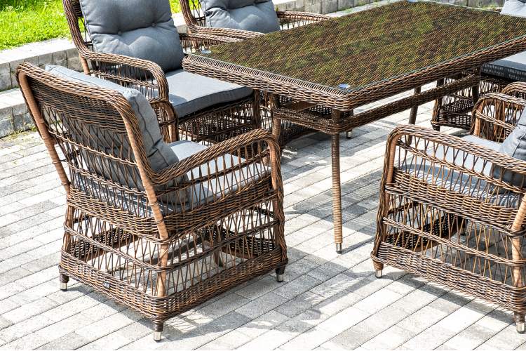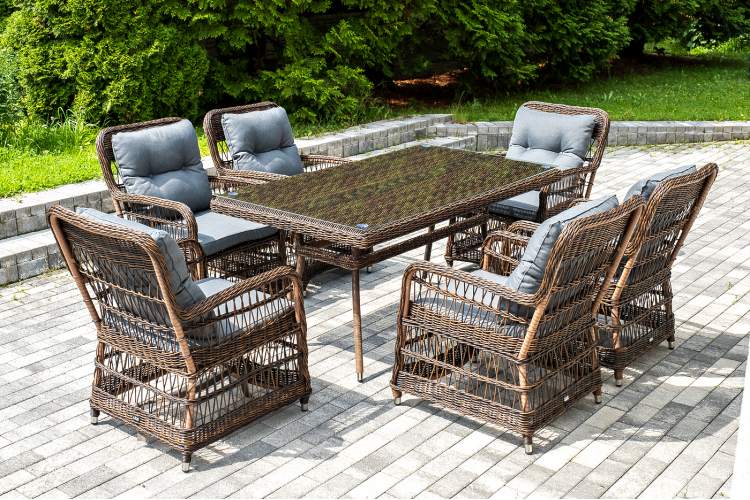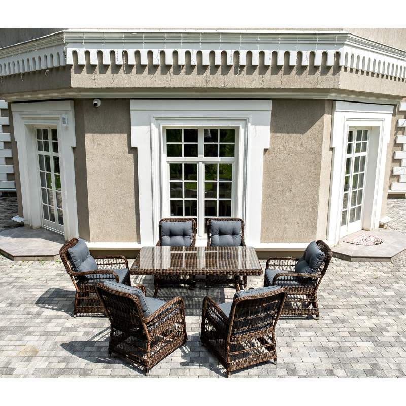 Садовая обеденная группа на 6 персон «Цесена» из ротанга. В комплекте: большой прямоугольный обеденный стол (1600×900×750 мм) и 6 кресел (600×800×910 мм). Вся мебель изготовлена из алюминия, вручную оплетенного круглым искусственным ротангом коричневого оттенка. Столешница укомплектована ударопрочным стеклом, толщиной 5 мм. Данное стекло крепится к столу при помощи четырех вакуумных силиконовых присосок и поставляется в собранном виде. "Цесена" кресло плетеное из искусственного ротанга, цвет коричневый 6шт. 600Х800Х910, "Латте" плетеный стол из искусственного ротанга 160х90см, цвет коричневый 1шт. 1 600Х900Х750,