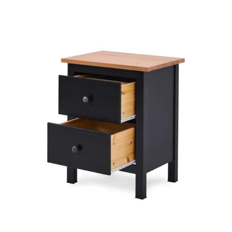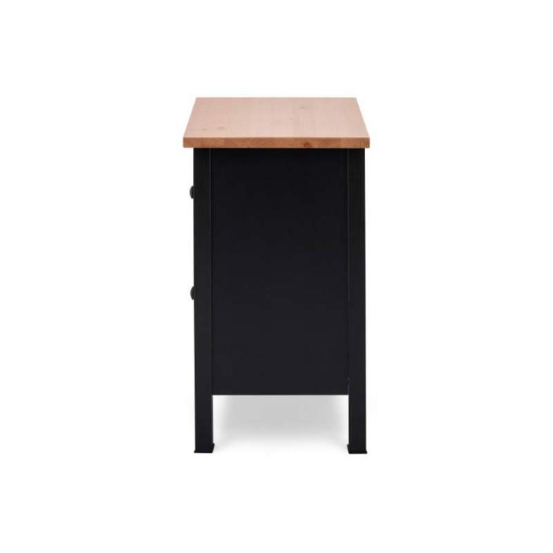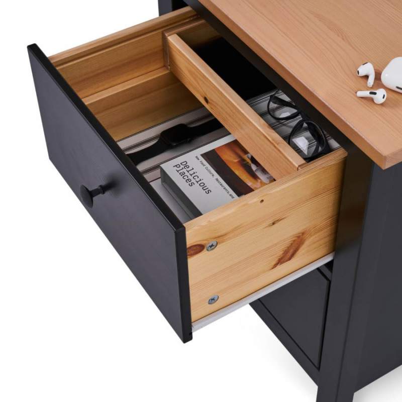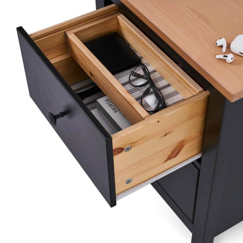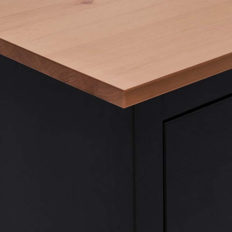 Материал комода — прочный и долговечный массив сосны. Матовое покрытие выполнено с использованием красителей на водной основе и лака на основе акриловых смол с УФ-отверждением. Оно подчеркивает природную красоту древесины и защищает её от внешних воздействий.