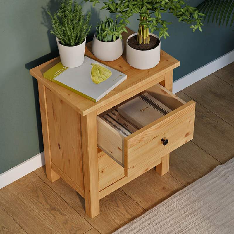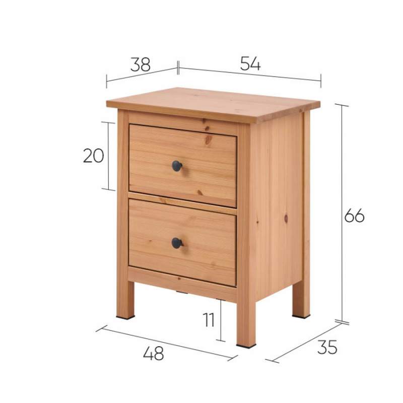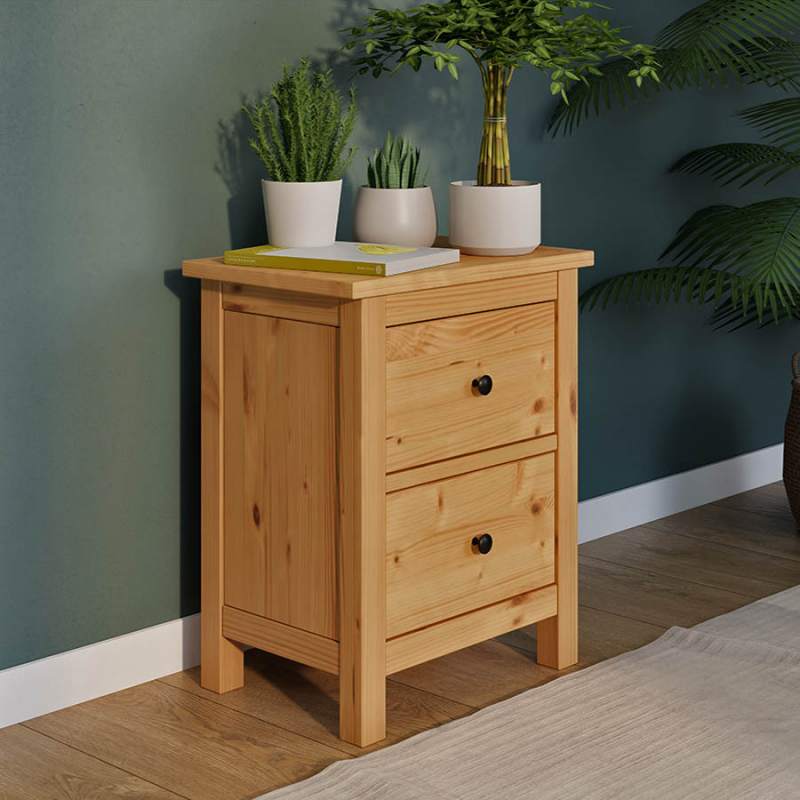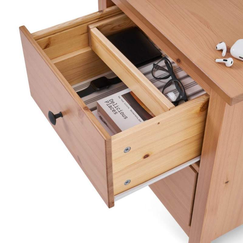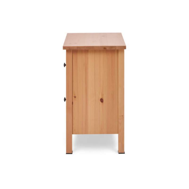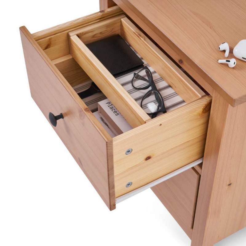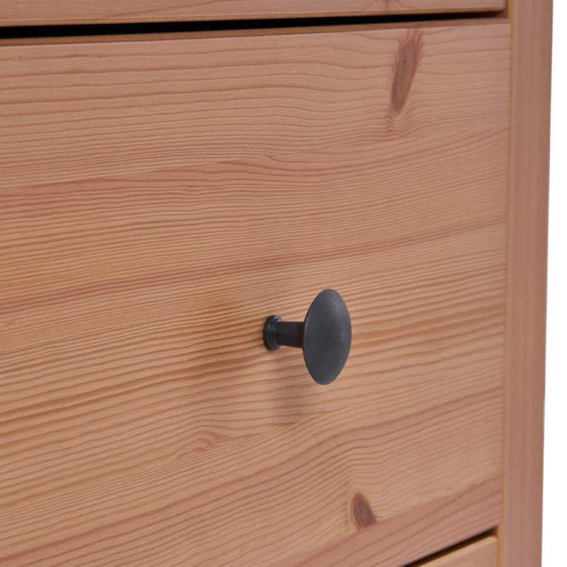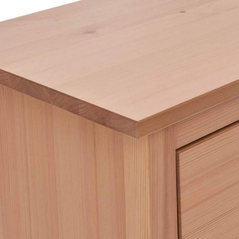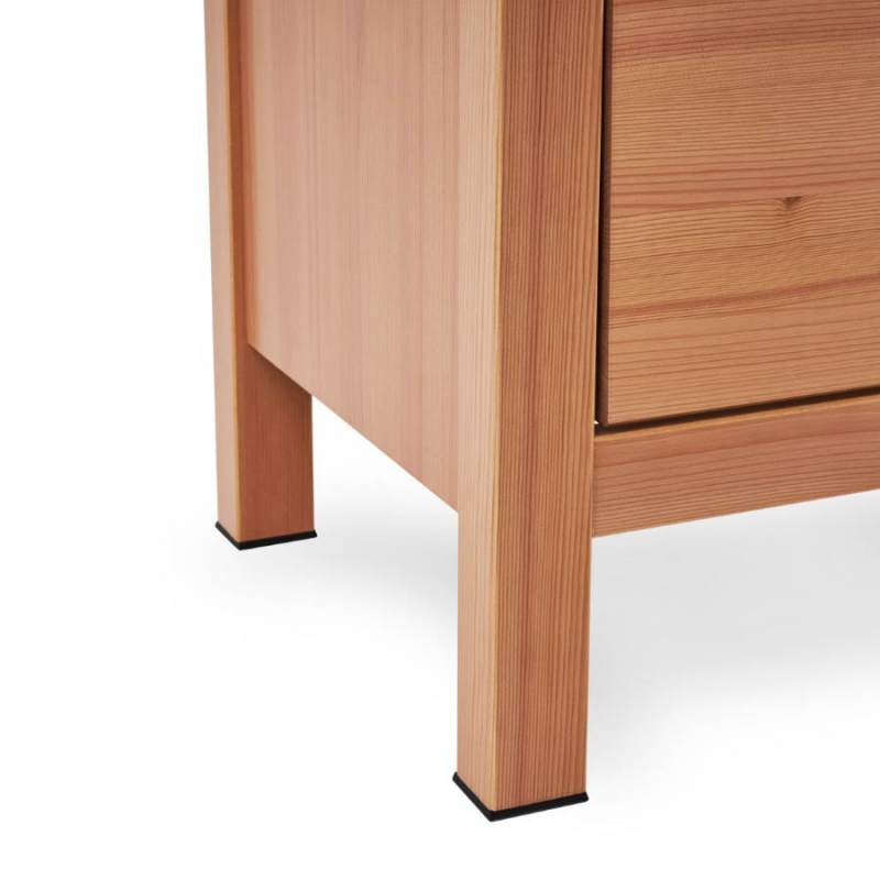 Материал комода — прочный и долговечный массив сосны. Матовое покрытие выполнено с использованием красителей на водной основе и лака на основе акриловых смол с УФ-отверждением. Оно подчеркивает природную красоту древесины и защищает её от внешних воздействий.