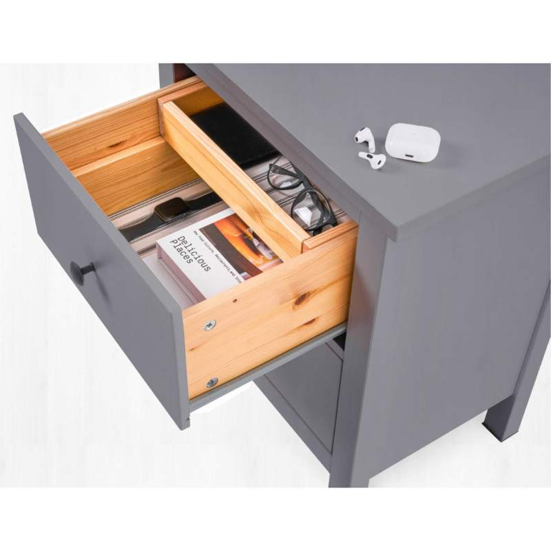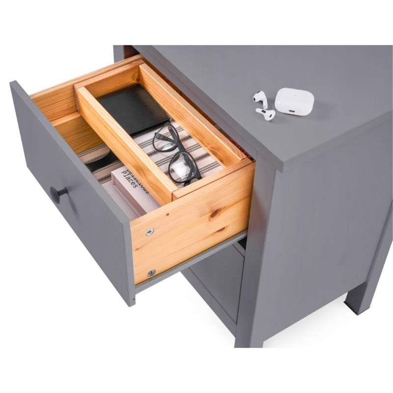 Материал комода — прочный и долговечный массив сосны. Матовое покрытие выполнено с использованием красителей на водной основе и лака на основе акриловых смол с УФ-отверждением. Оно подчеркивает природную красоту древесины и защищает её от внешних воздействий.