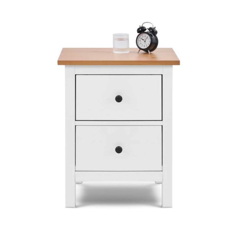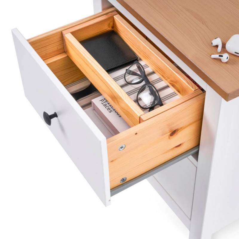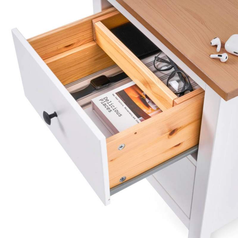 Плавное выдвижение ящиков обеспечивается роликовыми направляющими, а металлические ручки добавляют изделию стильный акцент.
