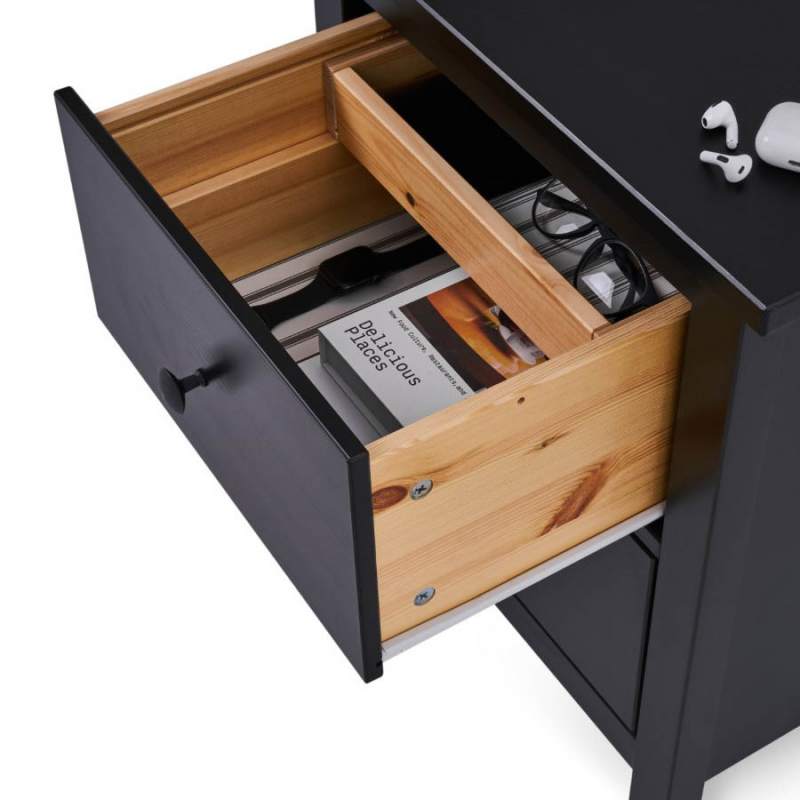 Материал комода — прочный и долговечный массив сосны. Матовое покрытие выполнено с использованием красителей на водной основе и лака на основе акриловых смол с УФ-отверждением. Оно подчеркивает природную красоту древесины и защищает её от внешних воздействий.
