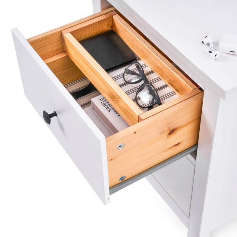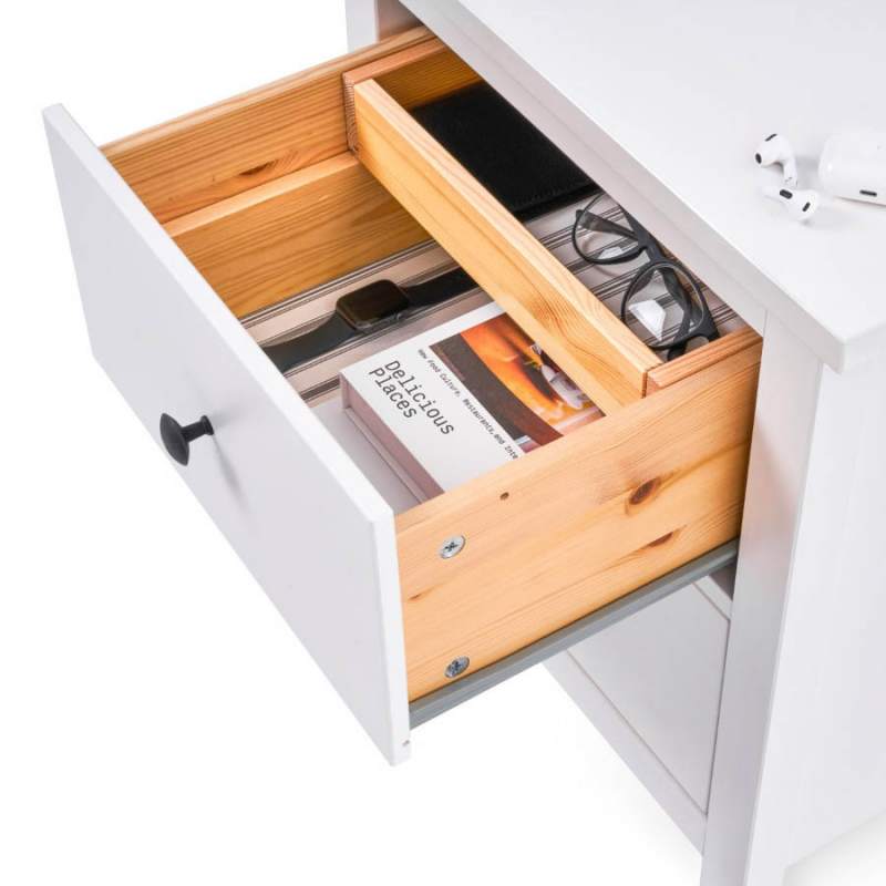 Плавное выдвижение ящиков обеспечивается роликовыми направляющими, а металлические ручки добавляют изделию стильный акцент.