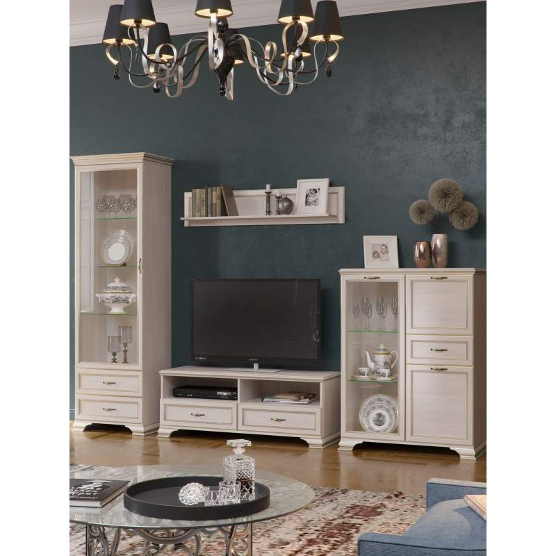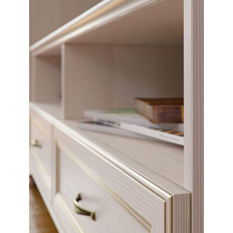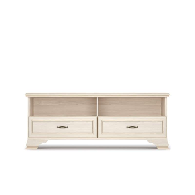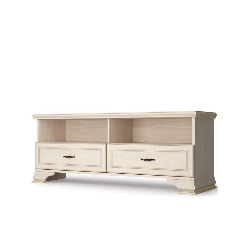 Тумба Сиена ТВ 1 имеет удобную конструкцию с двумя выдвижными ящиками для хранения различных вещей. Открытые ниши удобны для размещения аппаратуры.Дизайн в классическом стиле продуман до мелочей: фигурные профили МДФ фасадов и крышки, стильные опоры и ручки цвета «старая бронза». Завершают яркий и респектабельный вид модуля отблески золотой патины. Светлая цветовая гамма ЛДСП «Бодега белый» придаст интерьеру тепла и уюта.Оцените достоинства модуля:- высококачественные материалы и фурнитура. ЛДСП класса эмиссии Е1 гарантирует безопасность в вашем доме и отсутствие вредных испарений;- ящики комплектуются надежными шариковыми направляющими;- опоры позволят легко производить уборку под тумбой.Многообразие модулей в линейке «Сиена» дает вам возможность проявить творческий подход и создать свой неповторимый интерьер гостиной или спальни. Все предметы, входящие в состав коллекции универсальны для гостиной, спальни, прихожей или молодежной комнаты.