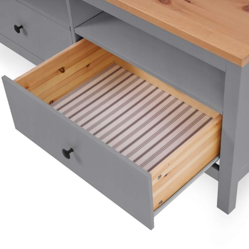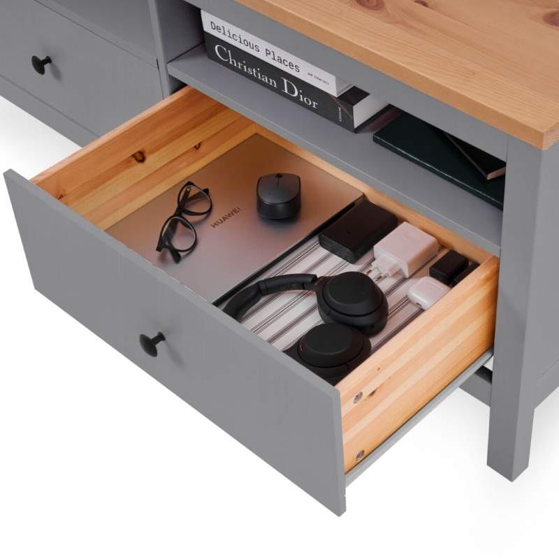 Имеет два ящика на роликовых направляющих, которые изнутри не покрашены, как основная часть, что придает им естественный вид.