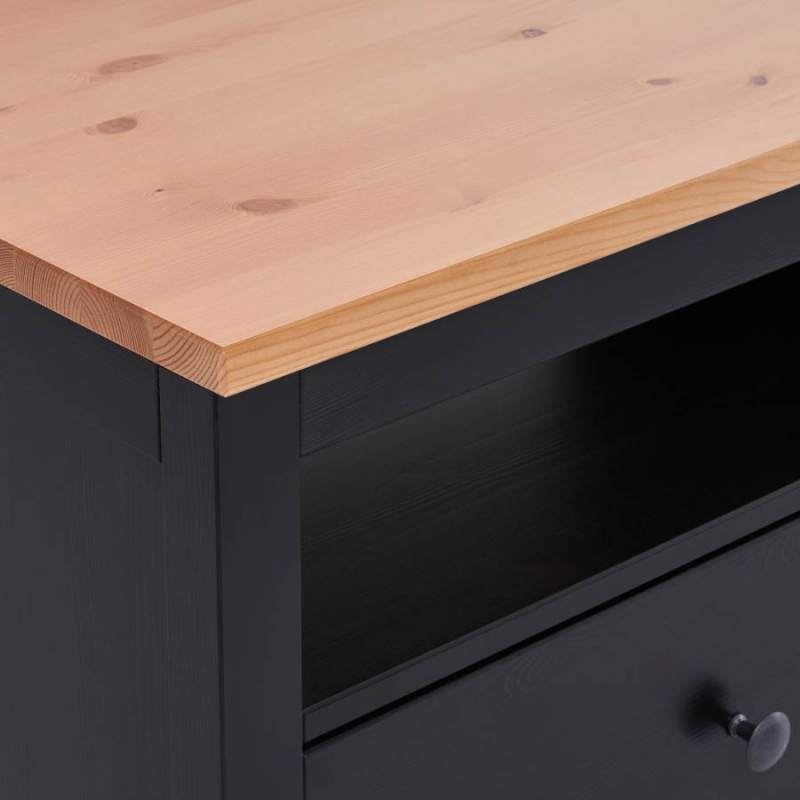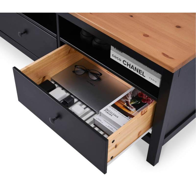 Имеет три ящика на роликовых направляющих, которые изнутри не покрашены, как основная часть, что придает им естественный вид.