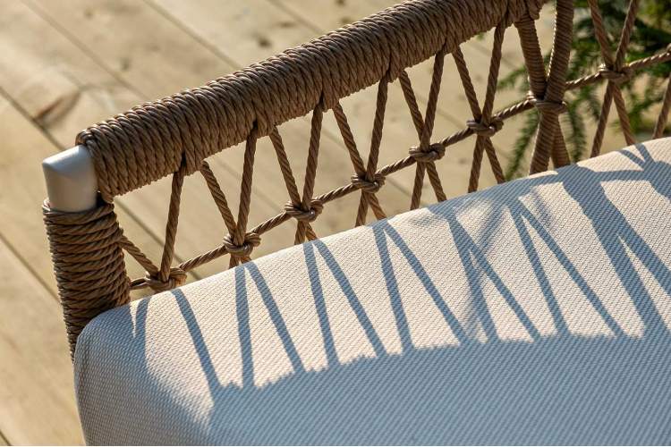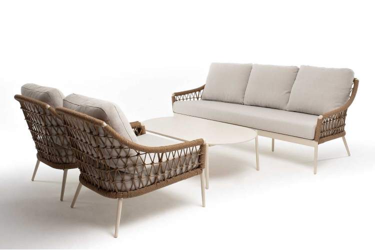 Вместительная лаунж-зона «Венеция» состоит из: - трехместного дивана – 2040×815×830 мм. - двух кресел – 800×800×855 мм. - журнального столика – 1300×700×380 мм. Модели имеют алюминиевый каркас, который оплетен вручную искусственным ротангом натурального соломенного цвета. Плетеная мебель дополнена удобными подушками в бежевых чехлах. При их изготовлении используют полиэстер, плотность – 300гр/м2. Он обрабатывается влагоотталкивающей пропиткой для повышения защитных свойств материала. Журнальный столик выполнен из алюминия, окрашенного износостойкой краской, цвет "слоновая кость". Столешница - овальная, выполнена из искусственного камня белового цвета.