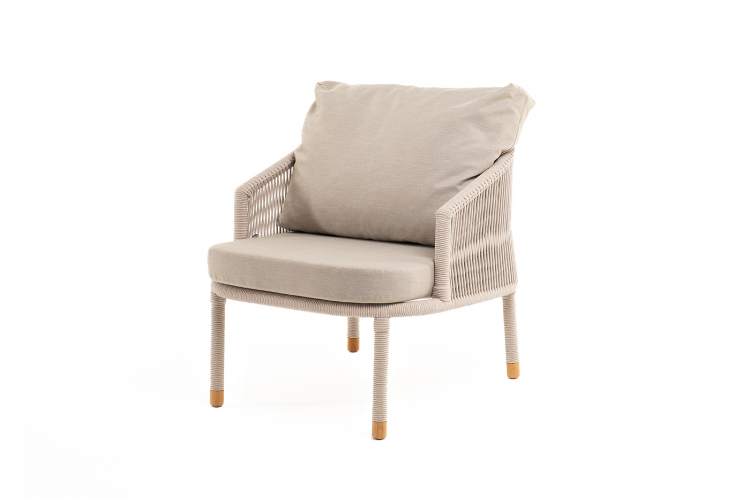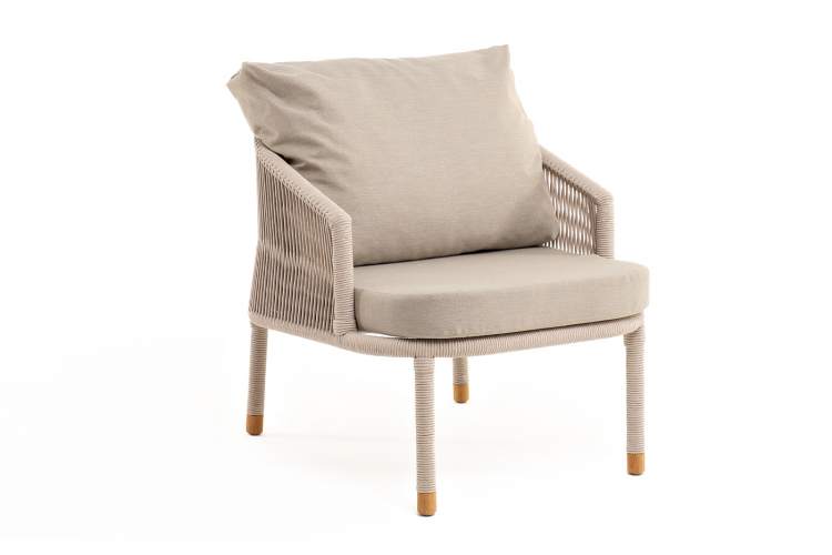 Плетеное кресло «Верона» с подушками в комплекте. Кресло имеет алюминиевый каркас, окрашенный порошковой краской в белый цвет. Боковины каркаса вручную оплетены роупом - эластичными синтетическими лентами, изготовленными из высокопрочных полиэфирных волокон. Цвет оплетки - бежевый. На ножках кресла идут дубовые наконечники (заглушки). Подушки со съёмными чехлами, которые обработаны влагоотталивающей пропиткой. Материал - 100% полиэстер, плотностью 300гр/м2. Размер садового кресла: 760x840х730 мм.