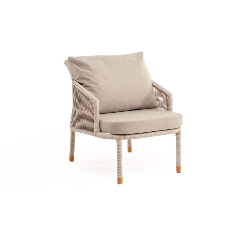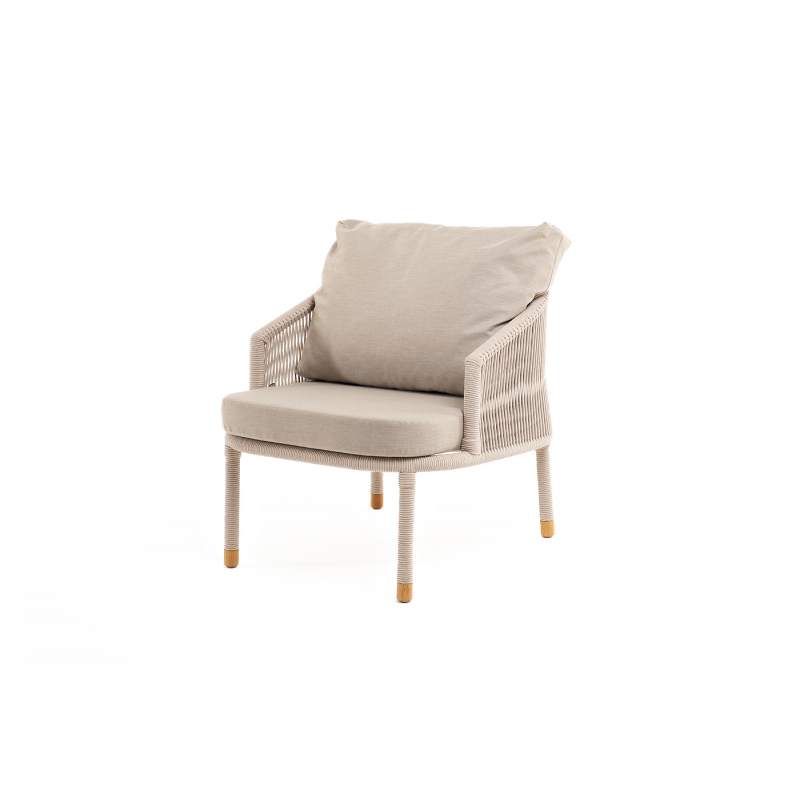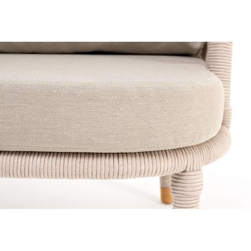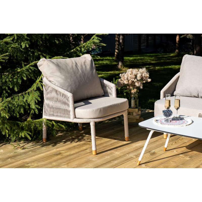 Кресло имеет алюминиевый каркас, окрашенный порошковой краской в белый цвет. Боковины каркаса вручную оплетены роупом - эластичными синтетическими лентами, изготовленными из высокопрочных полиэфирных волокон. Цвет оплетки - бежевый. На ножках кресла идут дубовые наконечники (заглушки).