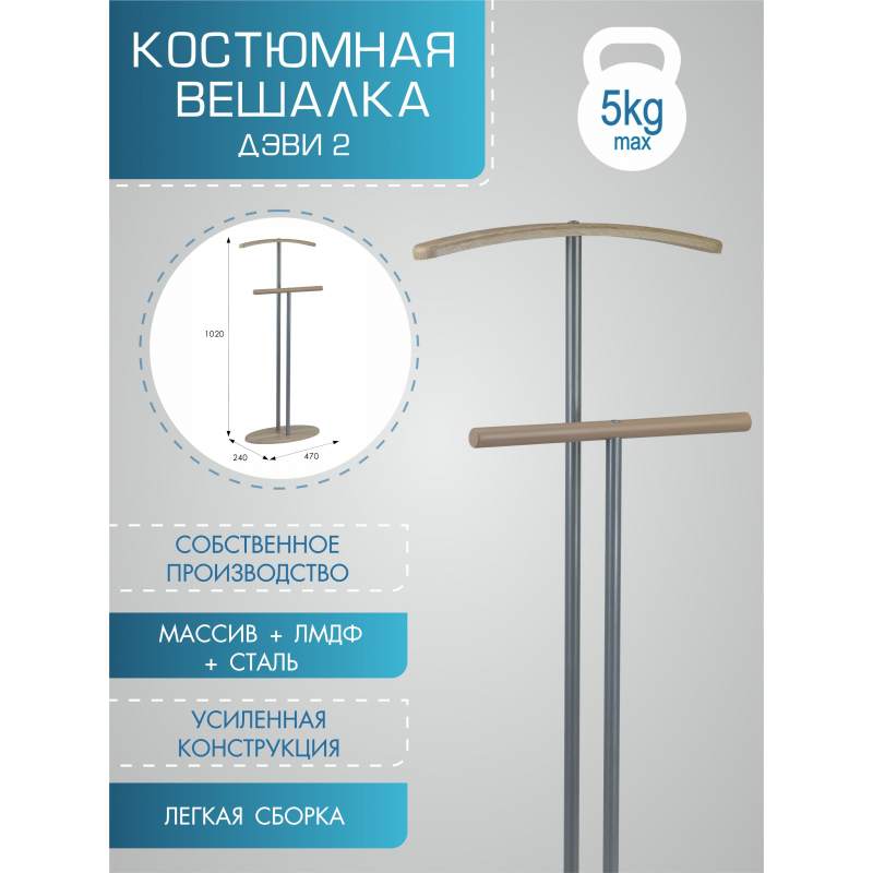 Металлическая вешалка для костюма Дэви 2 с элементами из натурального дерева. Простая, изящная, надежная конструкция без излишеств. Очень устойчивая конструкция, легко собирается. Компактно упакована, идеальный бизнес-подарок коллегам