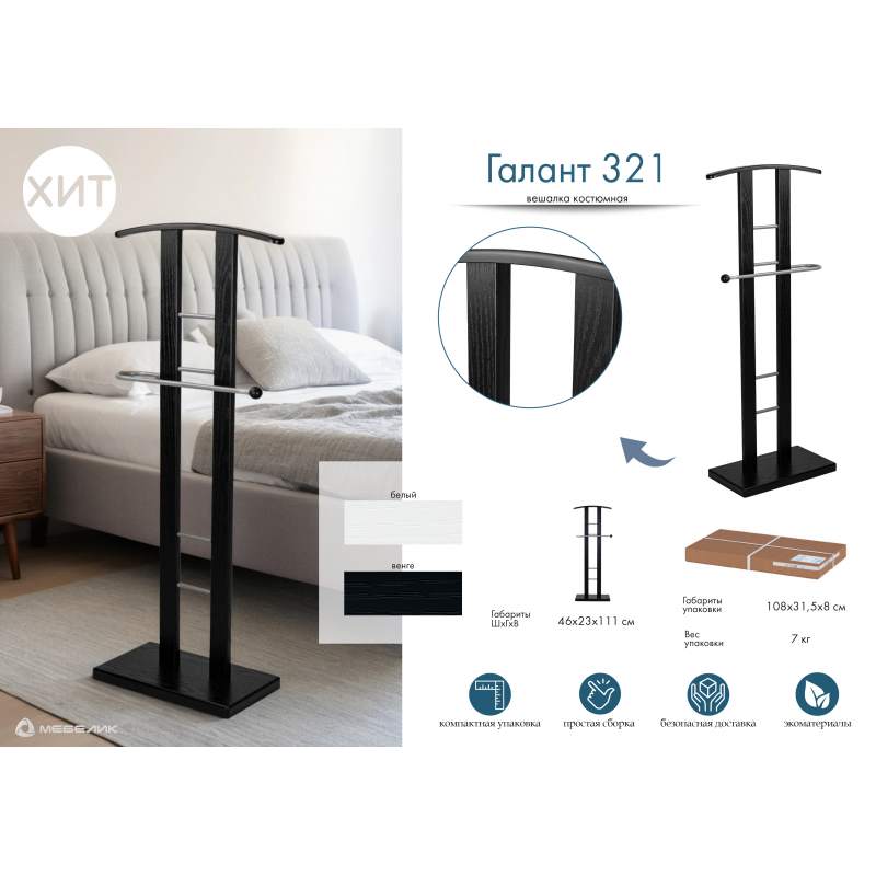 Приобрести Вешалка костюмная ГАЛАНТ 321 металлик/венге в интернет-магазине недорого по цене 6483р.. Нажав кнопку ХОЧУ СКИДКУ - оператор предложит лучшую цену если это возможно. Доставка в Москве и области со сборкой сразу. Отправляем в регионы России. Для заказа Вешалка костюмная ГАЛАНТ 321 металлик/венге 001011-09 001011 звоните по телефону: +7(495)642-45-92. Посмотреть Вешалка костюмная ГАЛАНТ 321 металлик/венге от mebelik можно в каталоге.