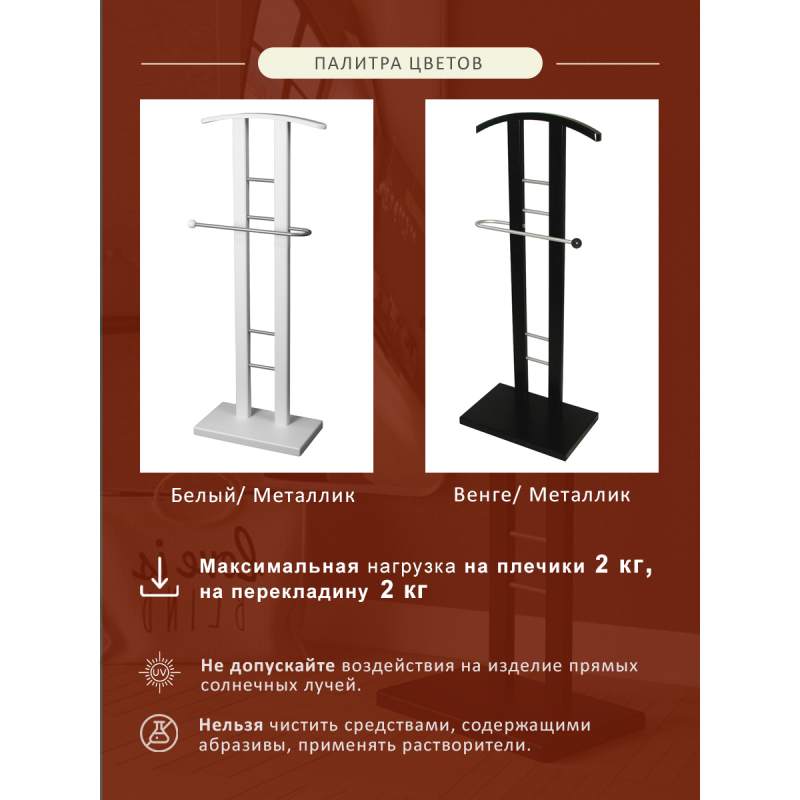 Костюмная вешалка Галант 321 станет отличным дополнением интерьера квартиры или дома. Основание, выполненное из МДФ, надежно удерживает вешалку на полу. Материалом для опор послужил шпон берёзы, что гарантирует долгую службу мебели, а тиснение с имитацией рисунка дерева позволит Вам создать натуралистичную красоту окружения. Деревянные детали крепко фиксируют изящные металлические крепления. Каждый элемент вешалки покрыт защитной эмалью.