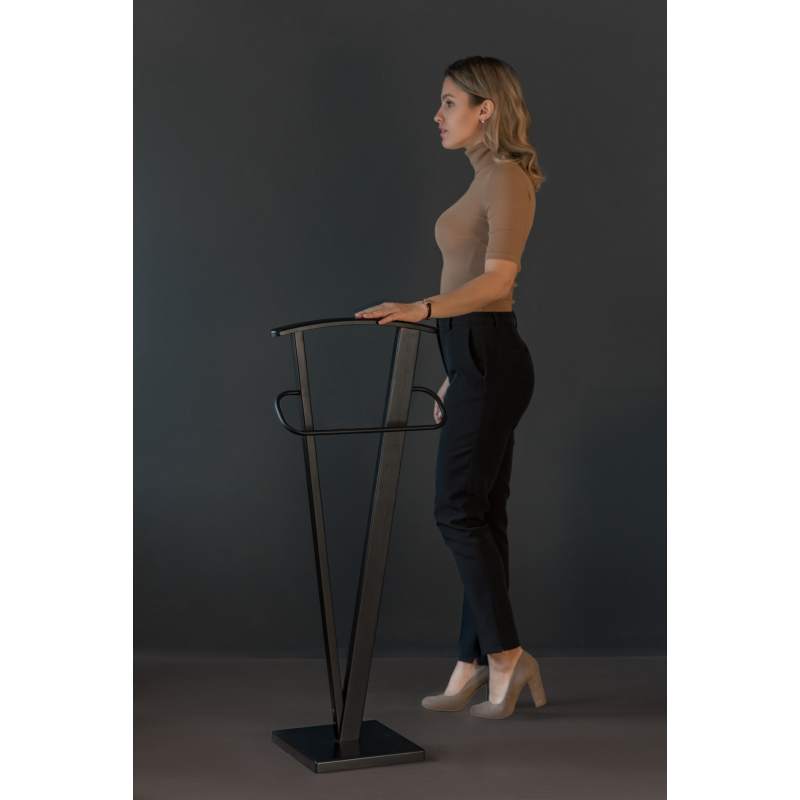 Модель костюмной вешалки Галант 344 в черном варианте исполнения предназначена для мужчин, поддерживающих порядок в спальне и возле рабочего места. Вешалка весьма лаконична, в ней нет лишних деталей, тем не менее, позволяет разместить на ней пиджак, сорочку и брюки. Перекладина для брюк достаточно широкая, и подходит для любых размеров одежды. Кроме того, при необходимости, через нее можно перекинуть галстук и ремень. Ассиметричная конструкция напоминающая латинскую букву V не приедается со временем, основание делает всю конструкцию устойчивой.