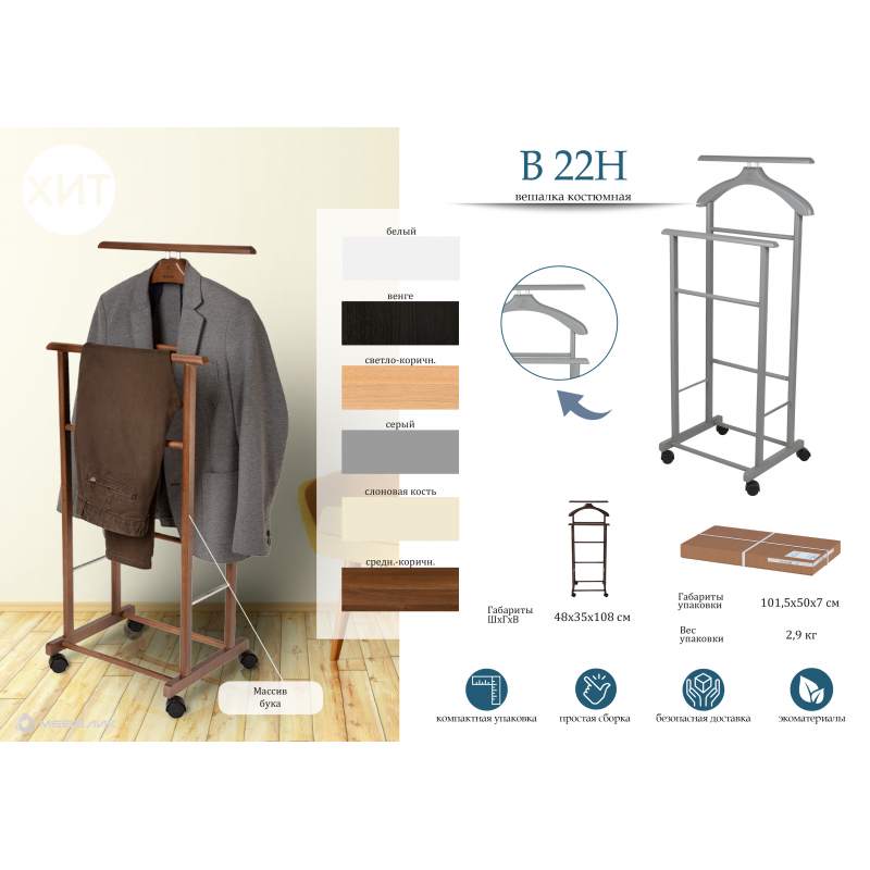 Костюмная вешалка В 22Н сочетает в себе элегантный дизайн и практичность. Деревянное изделие выполнено из цельного массива бука, придающего прочность и долговечность. Специальное покрытие защищает одежду от возможных потёртостей и повреждений. Благодаря наличию колёсиков Вы без проблем сможете перемещать вешалку по квартире или дому. Максимальная нагрузка 7 кг.