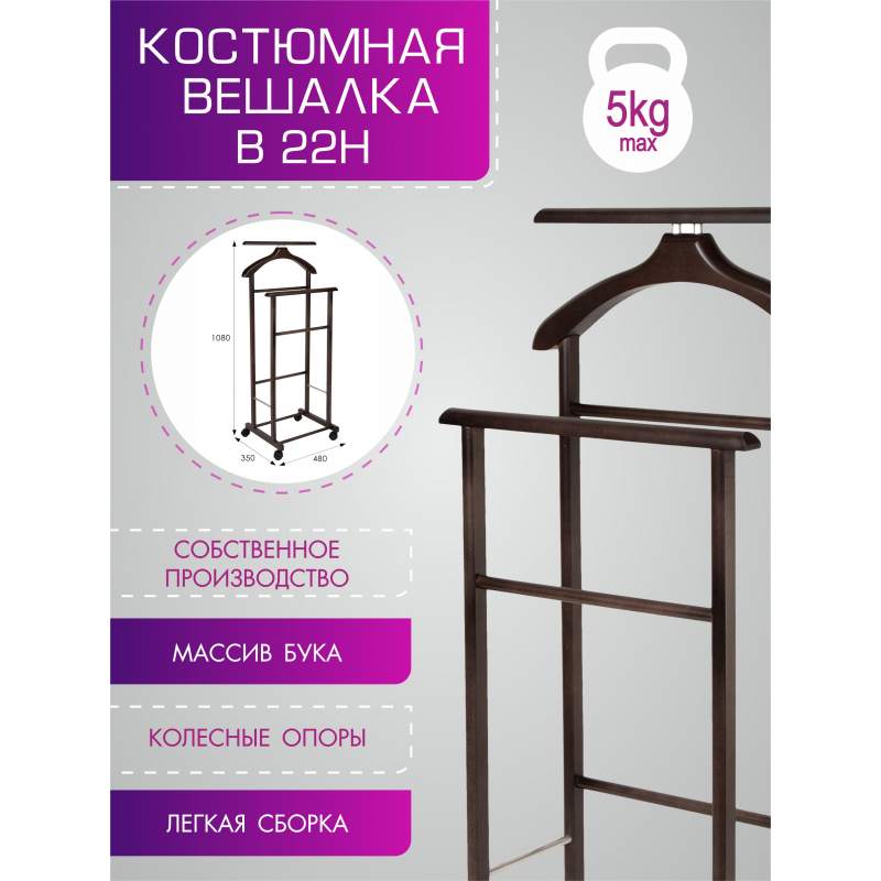 Костюмная вешалка В 22Н сочетает в себе элегантный дизайн и практичность. Деревянное изделие выполнено из цельного массива бука, придающего прочность и долговечность. Специальное покрытие защищает одежду от возможных потёртостей и повреждений. Благодаря наличию колёсиков Вы без проблем сможете перемещать вешалку по квартире или дому. Максимальная нагрузка 7 кг.